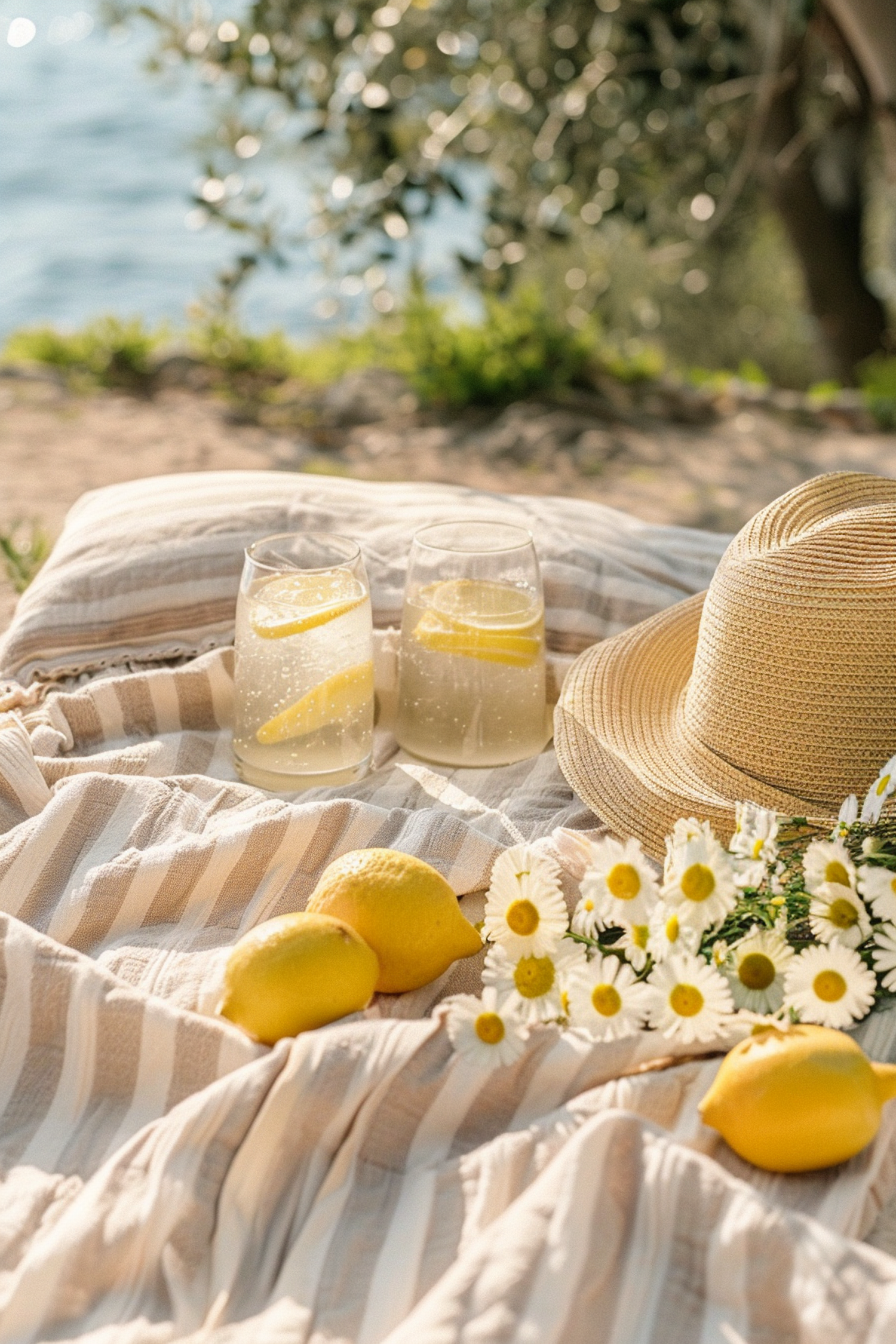 Charming picnic setup with lemonade, lemons, daisies, and a straw hat on a striped blanket by a sunlit lake.