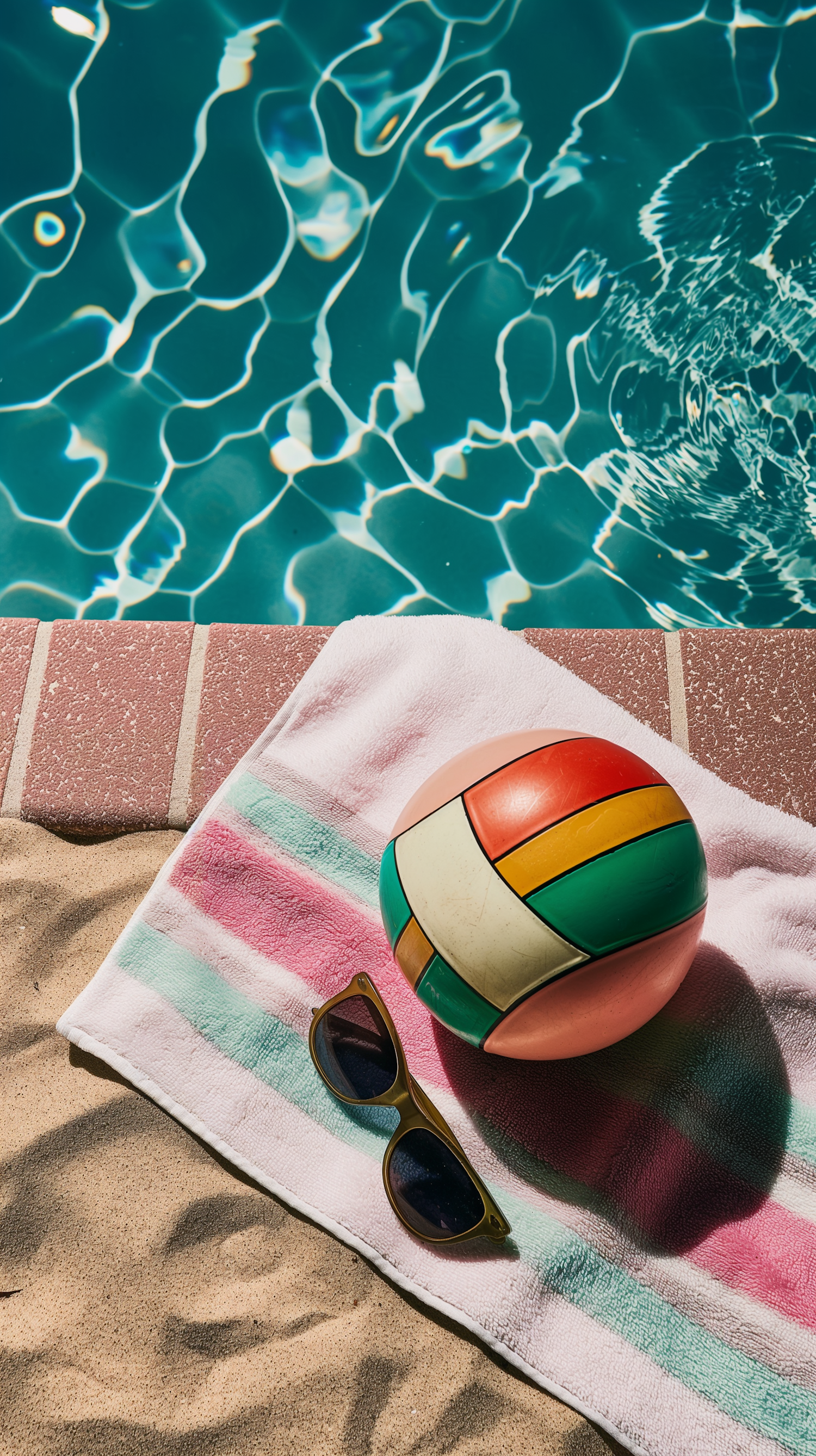 Colorful beach ball and sunglasses on a striped towel by a turquoise pool, capturing a sunny, summery vibe.