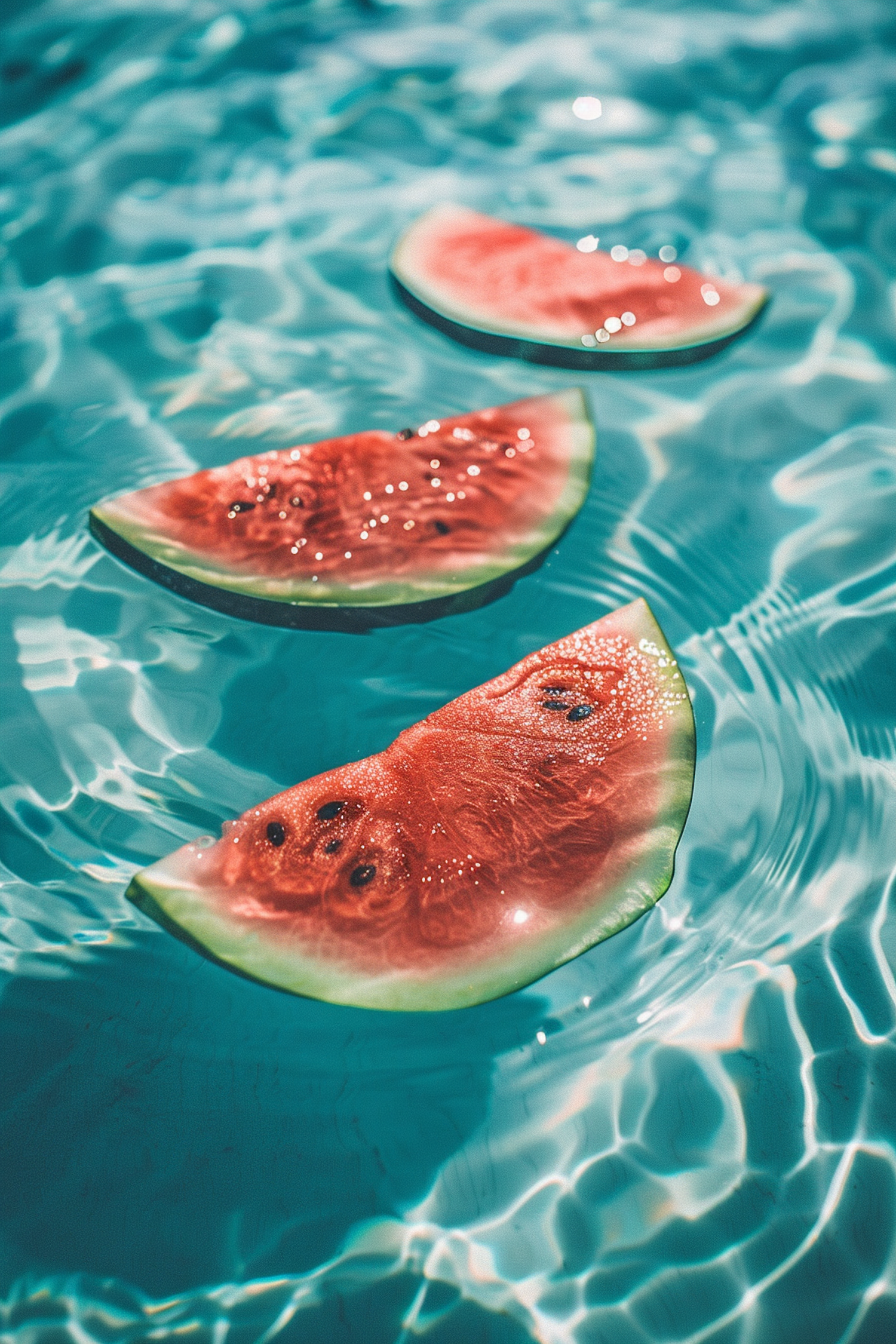 Watermelon slices floating in a clear blue pool, creating a refreshing summer vibe with vibrant colors and rippling water reflections.