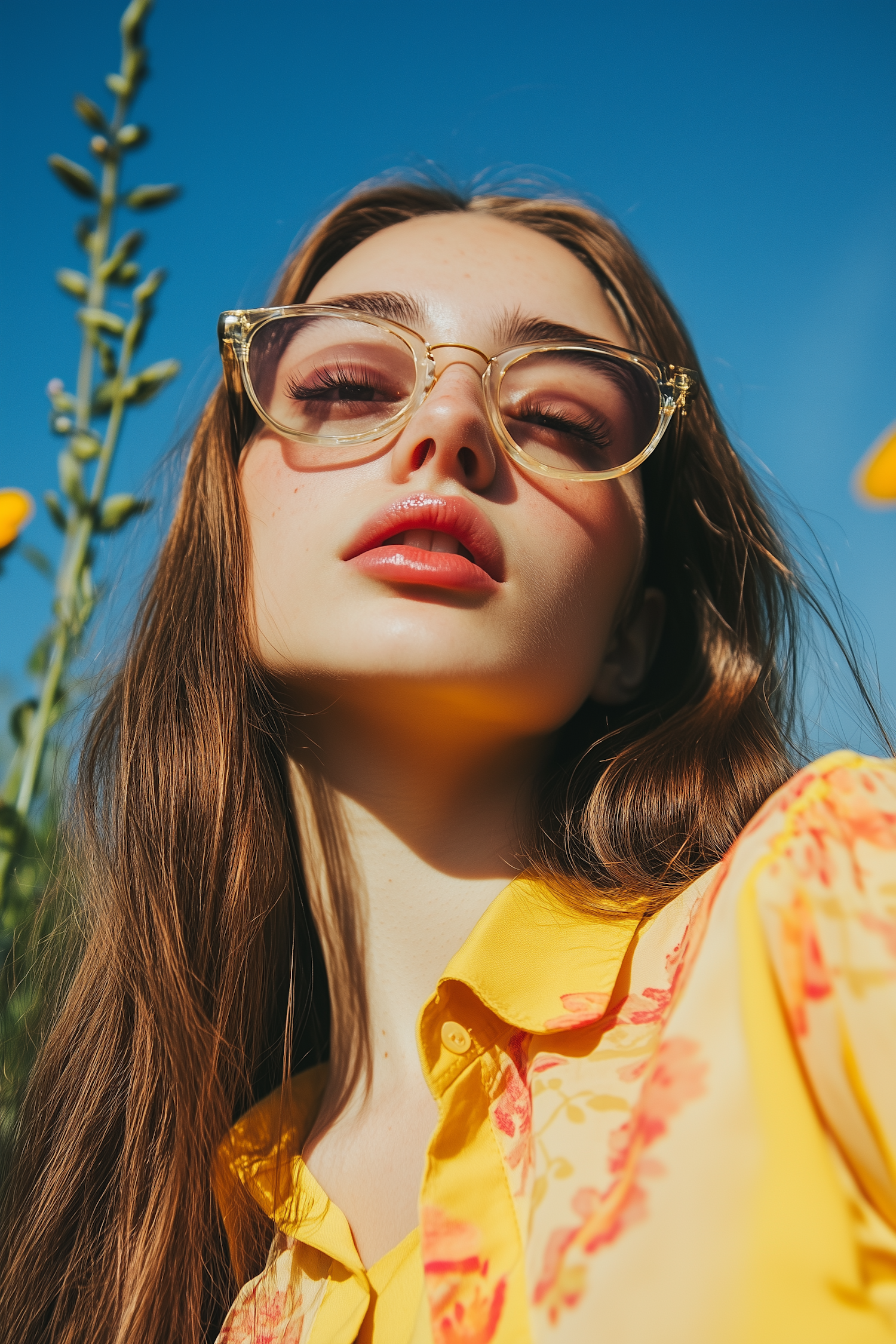 Close-up of a woman in yellow floral blouse and cat-eye glasses, set against a bright blue sky with a summery vibe.