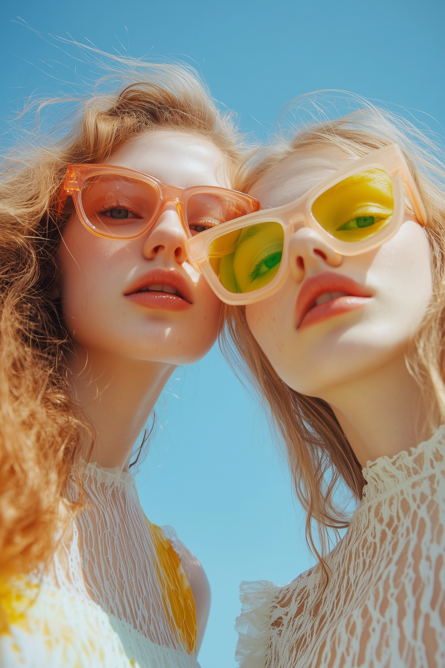 Two women in translucent sunglasses pose under a bright blue sky, exuding a playful summer vibe with light lace tops and natural hair.