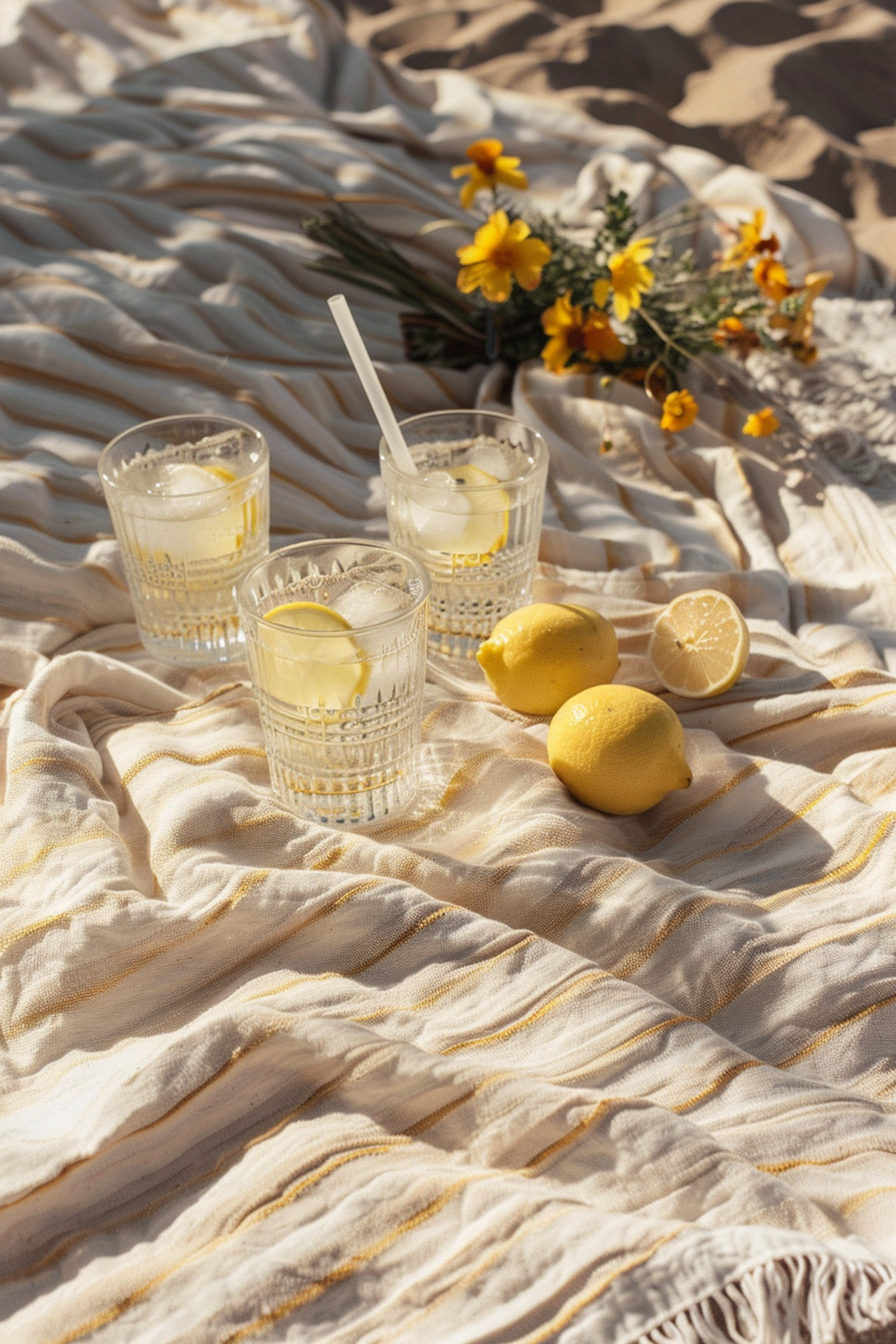 Refreshing lemonade glasses with lemons on a striped blanket, accented by yellow flowers in warm sunlight.