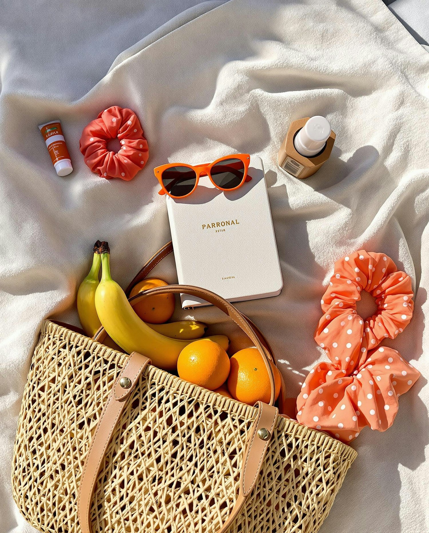 A summery flat lay with a woven bag, fruits, orange sunglasses, polka-dot scrunchies, and skincare essentials on a light fabric.