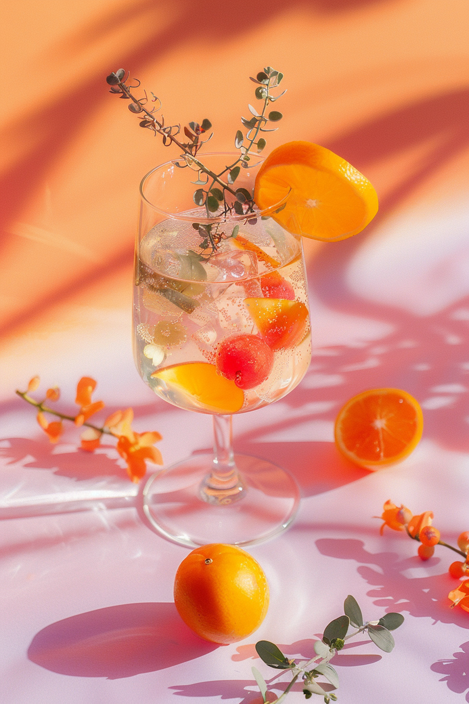 Refreshing citrus drink with herbs in a wine glass, surrounded by oranges and flowers on a warm orange background.