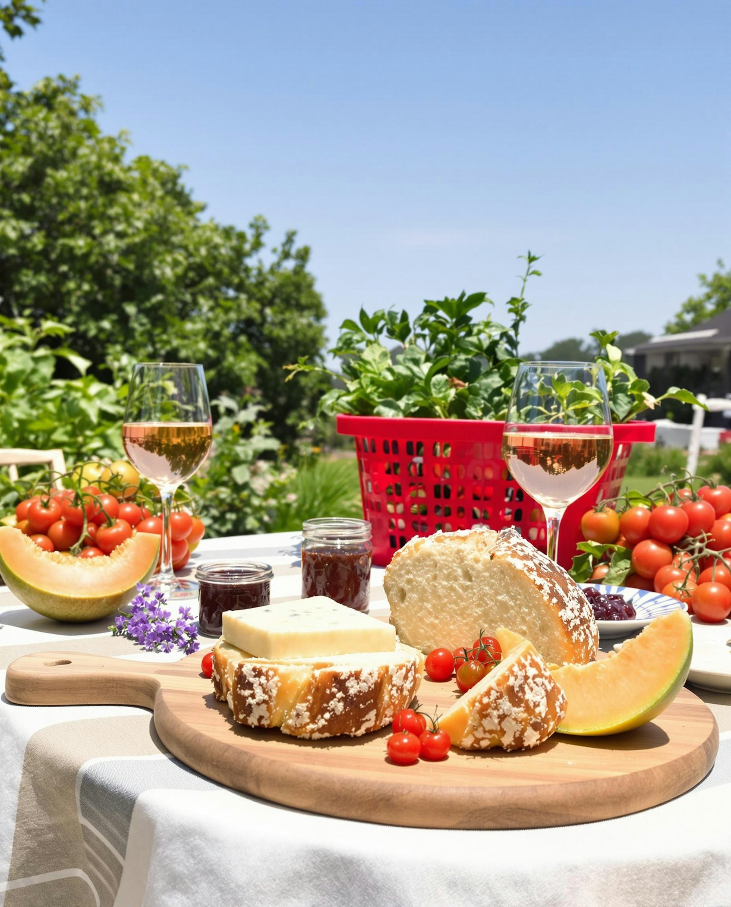 studio-quality photo, sunny picnic scene with vibrant summer lighting, clear blue sky lighting, hard shadows, soft natural colors, overhead composition, 50mm lens look, sharp focus, professional food styling, minimal props, striped or neutral picnic cloth, realistic textures and proportions, no distortion an outdoor round garden table set for lunch: a wooden board with slices of rustic sourdough bread, blue cheese wedge, half a melon, a jar of cherry jam, a glass of rosé wine, fresh tomatoes on the vine, and a red plastic basket filled with green vegetables in the background