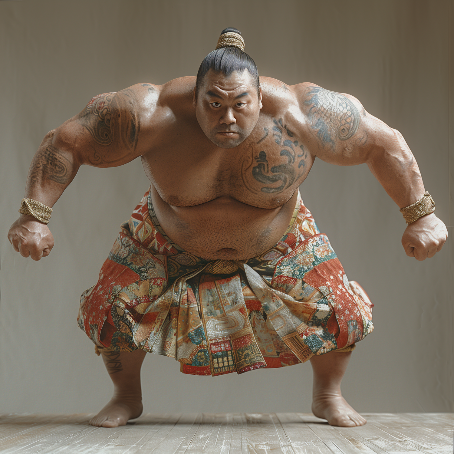 Powerful sumo wrestler in traditional attire, showcasing tattoos and intense focus, standing on a wooden floor.