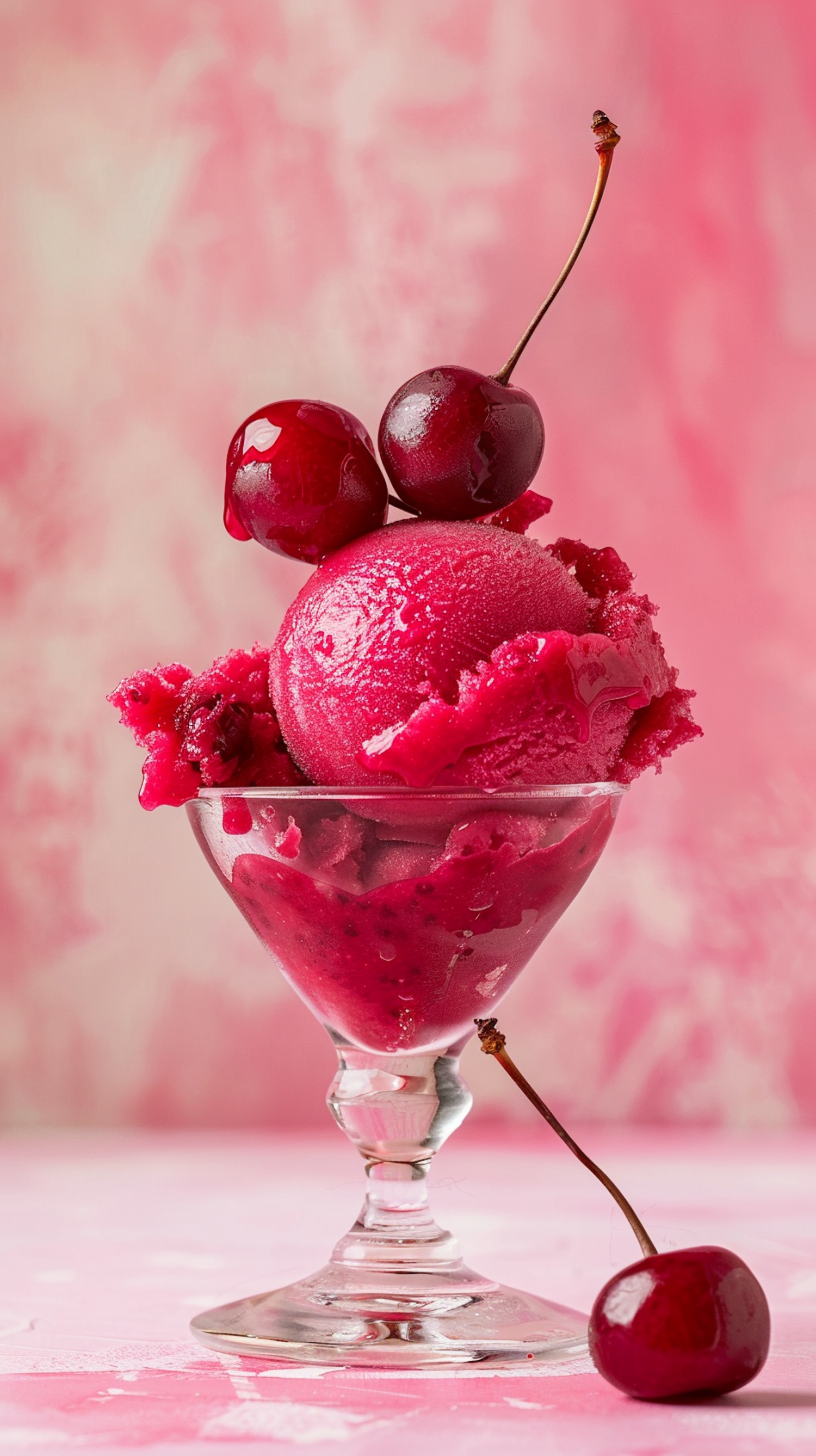 Vibrant pink sorbet in a glass cup topped with cherries, set against a soft pink background. A delightful and appetizing dessert scene.