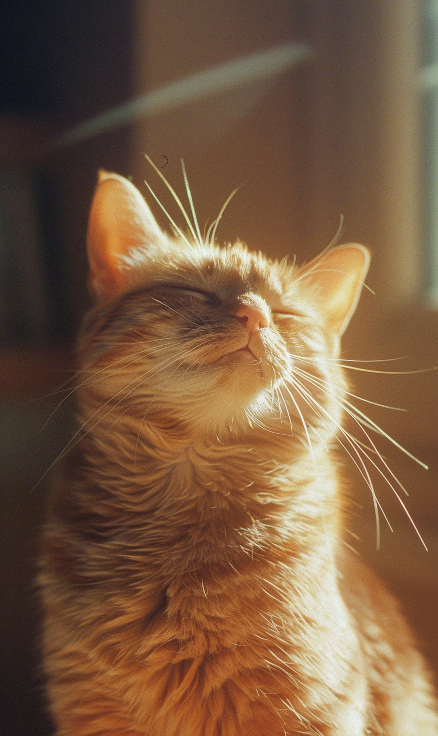 Ginger cat enjoying warm sunlight, eyes closed in contentment, with soft fur and whiskers highlighted by golden light.