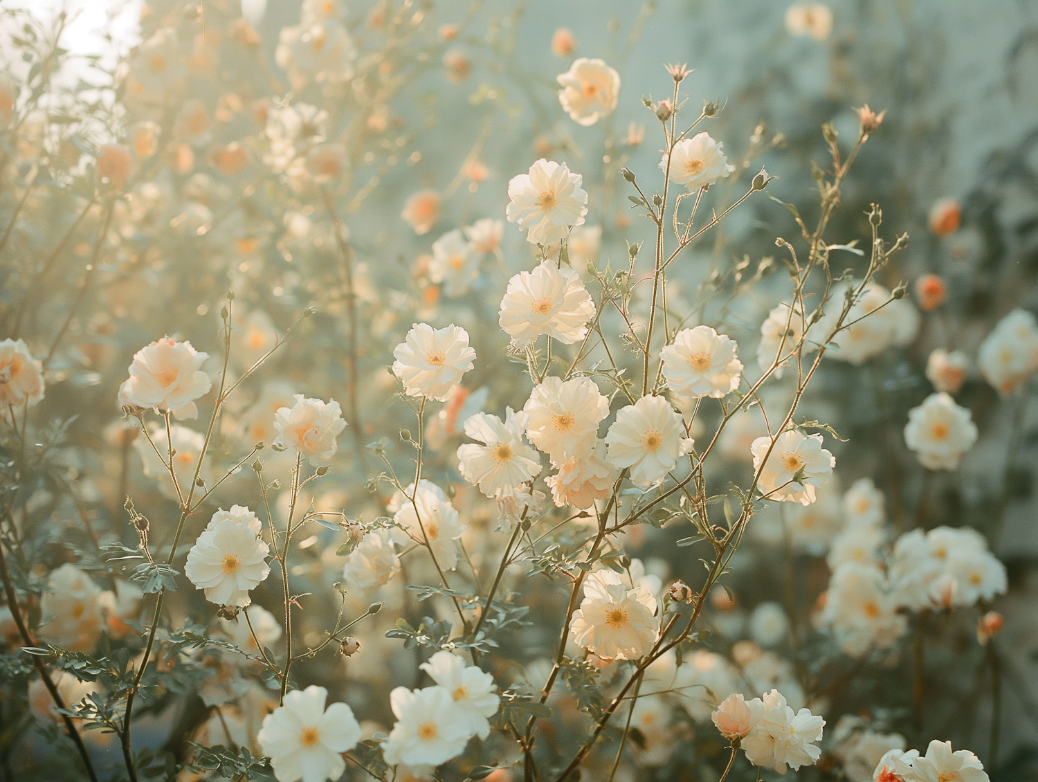 A dreamy garden with pale peach roses in full bloom, bathed in gentle sunlight, creating a tranquil and romantic atmosphere.
