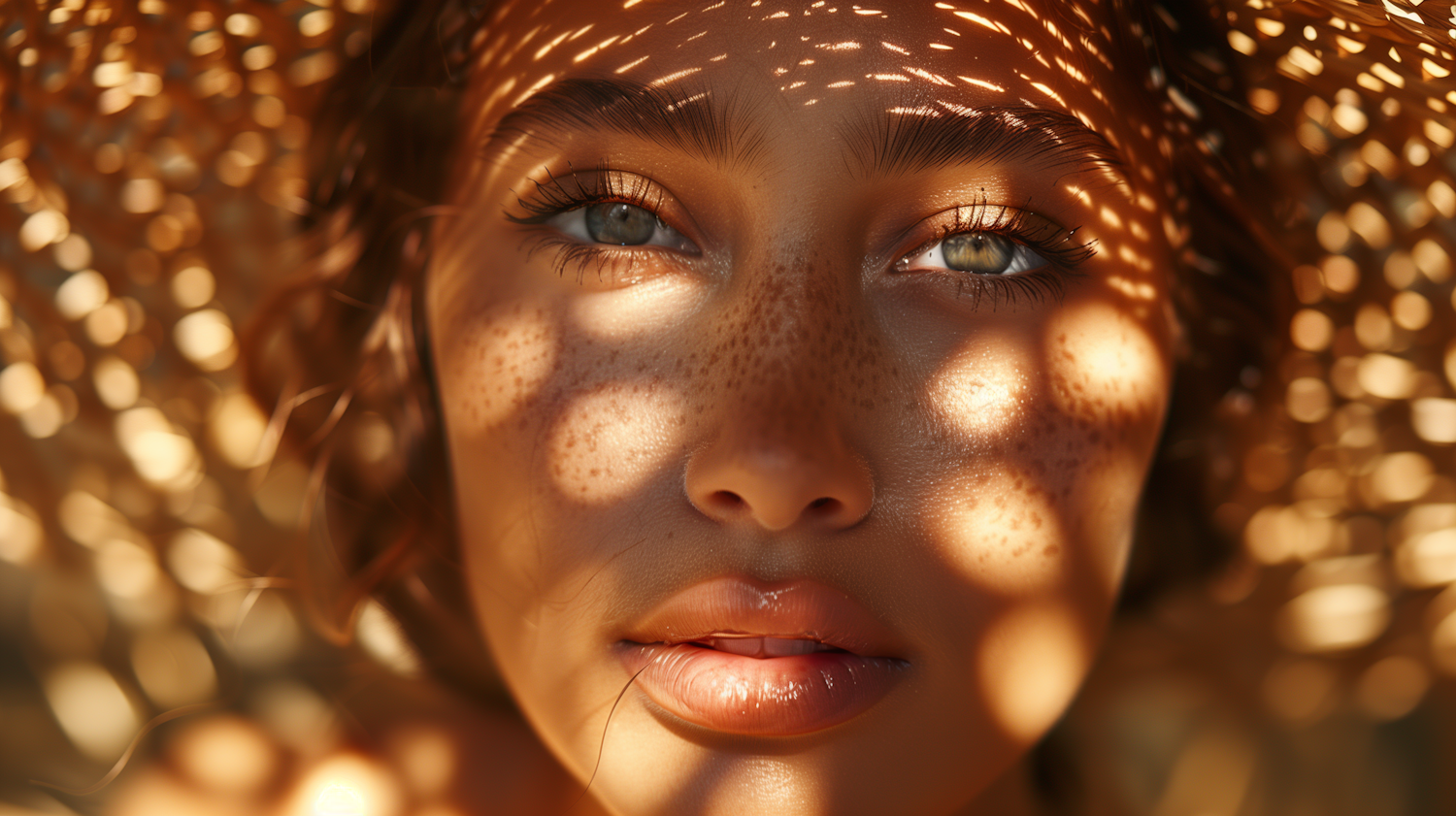 Close-up of a woman with freckles and blue-green eyes, sunlight casting patterns through a woven hat. Warm, golden tones highlight her features.