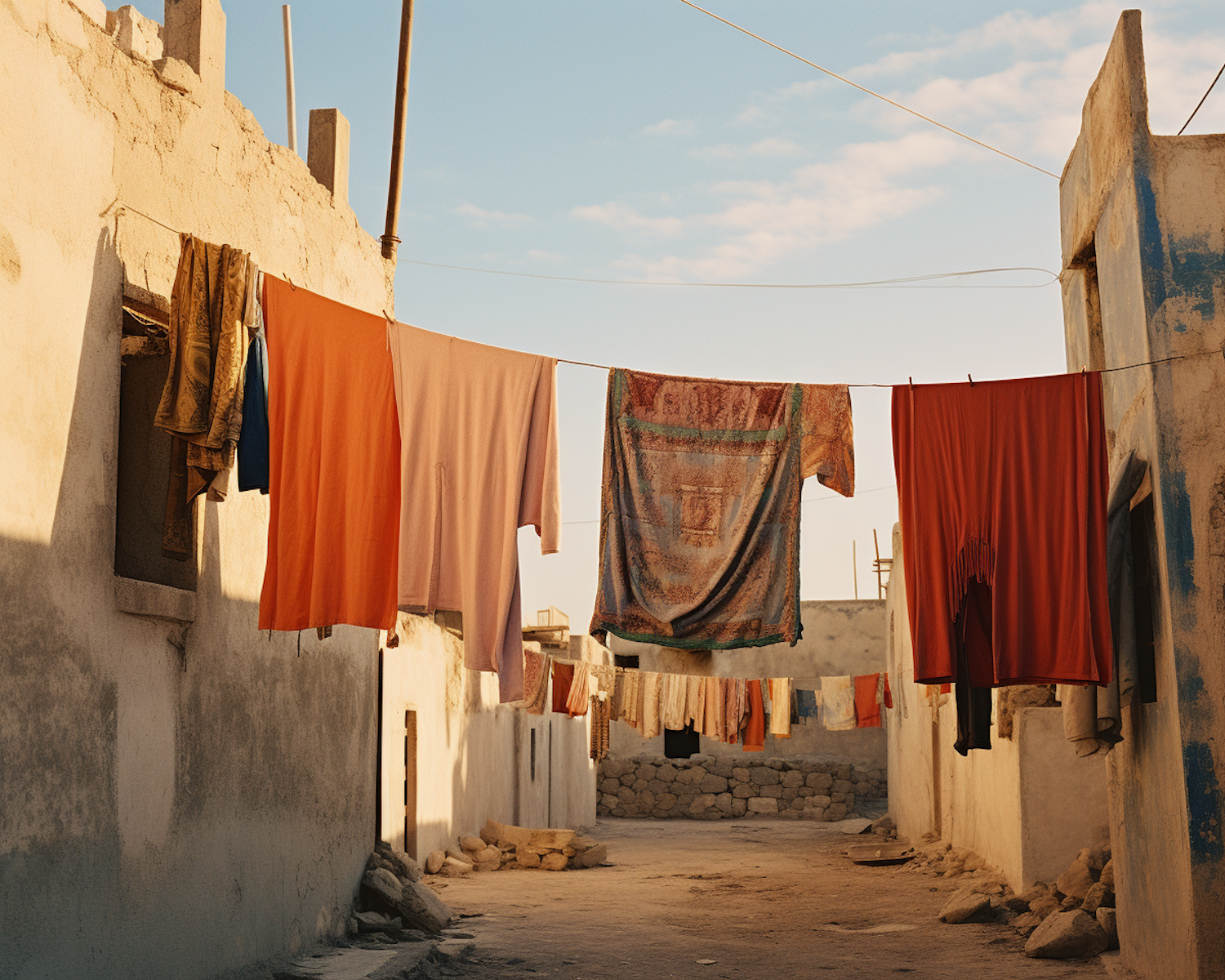 Clothes hanging on lines in a rustic alleyway between aged stone buildings, bathed in warm sunlight.