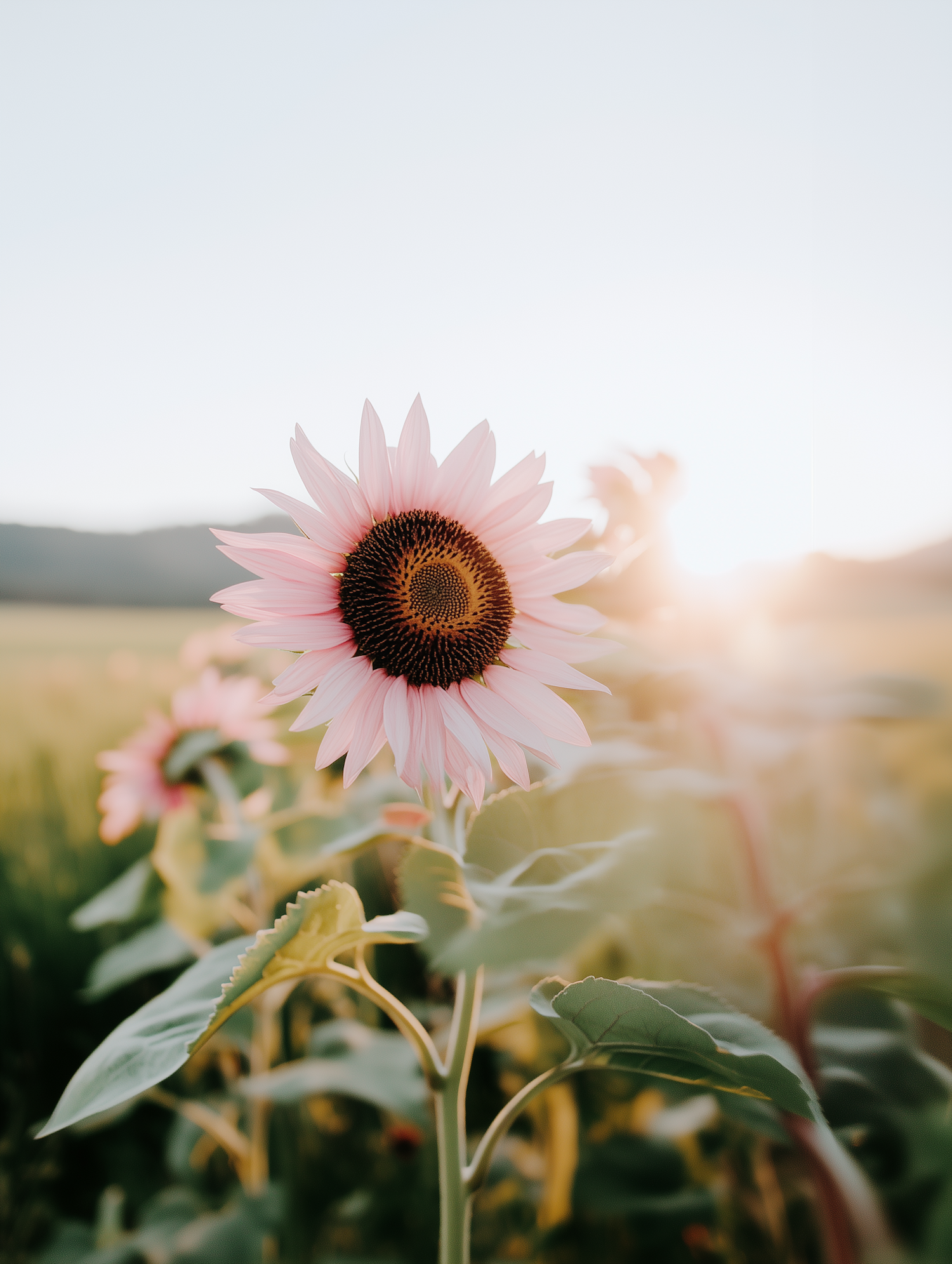A pink sunflower in a sunlit field with a clear sky, creating a serene and picturesque natural scene.