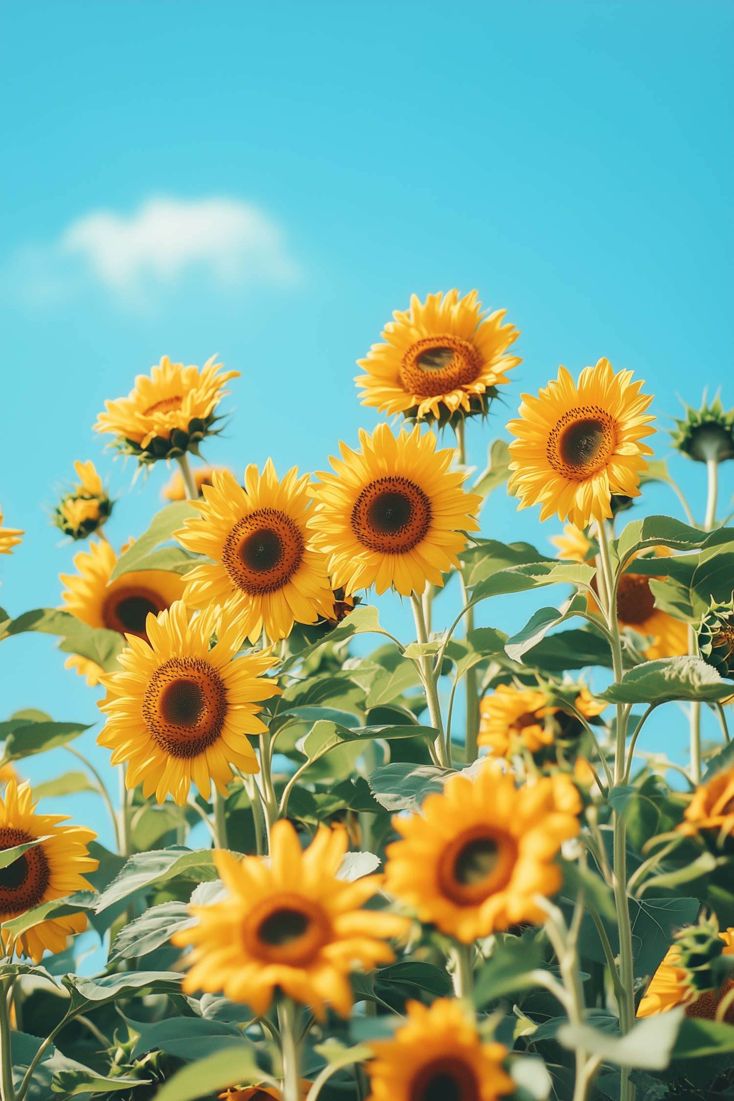 Bright sunflowers in full bloom under a clear blue sky with a single fluffy cloud, creating a vibrant and cheerful summer scene.
