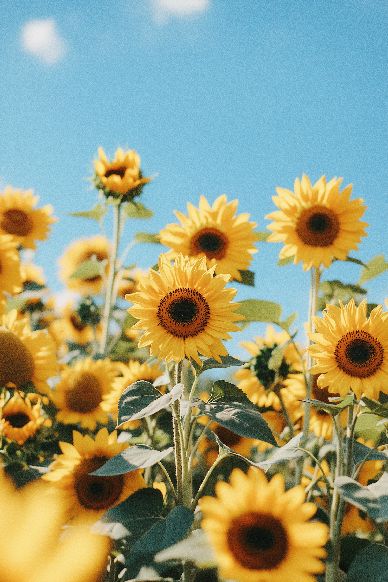 Bright sunflowers in full bloom under a clear blue sky, creating a cheerful and vibrant summer scene.