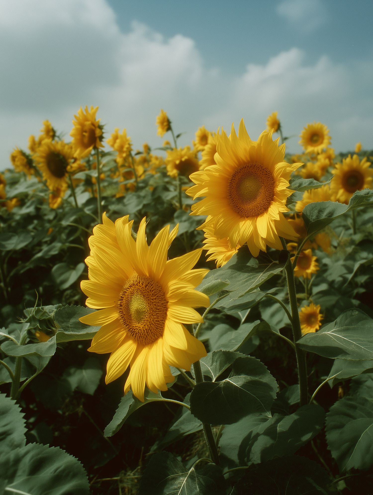 A vibrant sunflower field under a blue sky, showcasing bright yellow blooms and lush green leaves in a serene natural setting.
