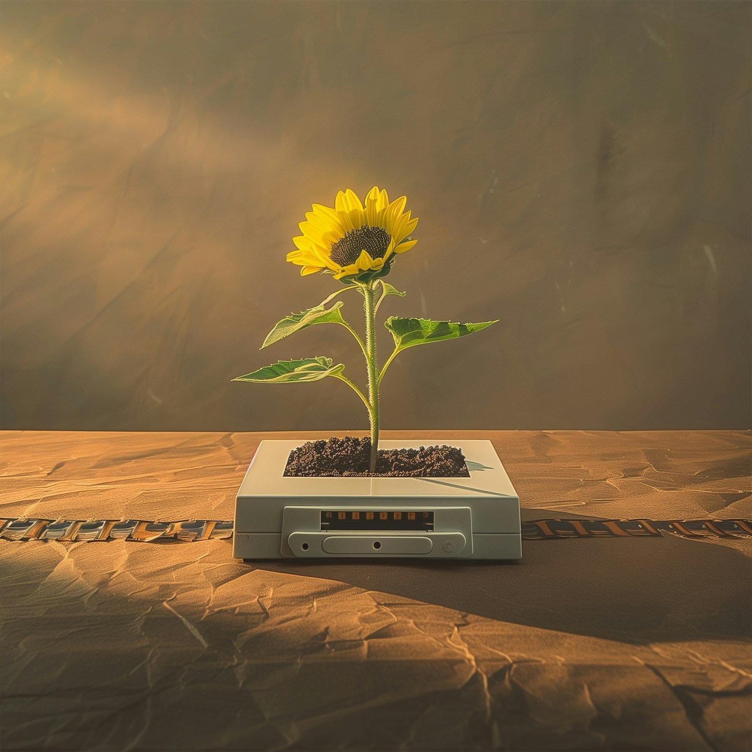 A sunflower growing from a retro cassette tape, blending nature and technology in a warm, nostalgic setting.