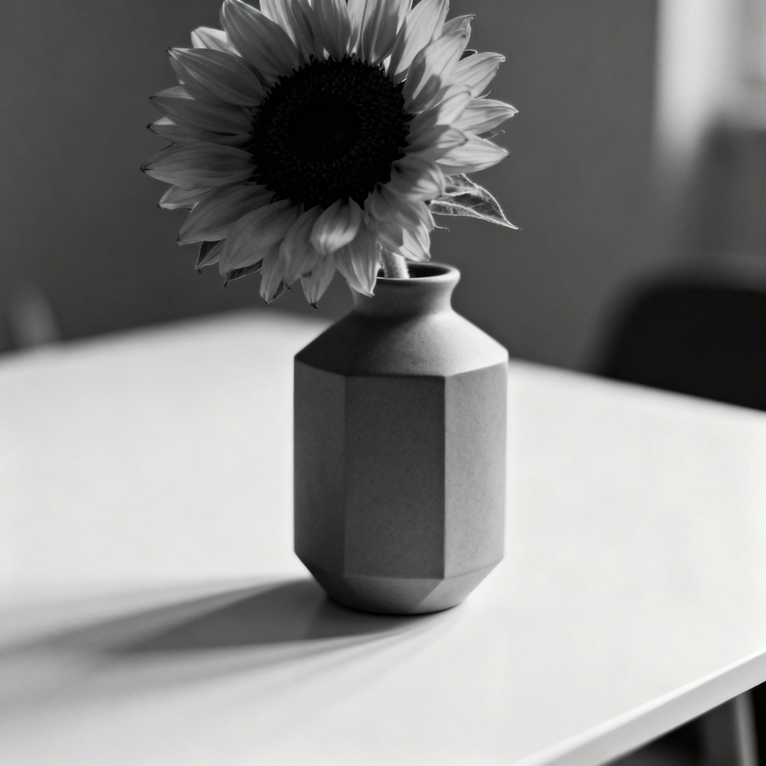 Monochrome image of a sunflower in a geometric vase on a smooth surface, with soft shadows and a blurred background.
