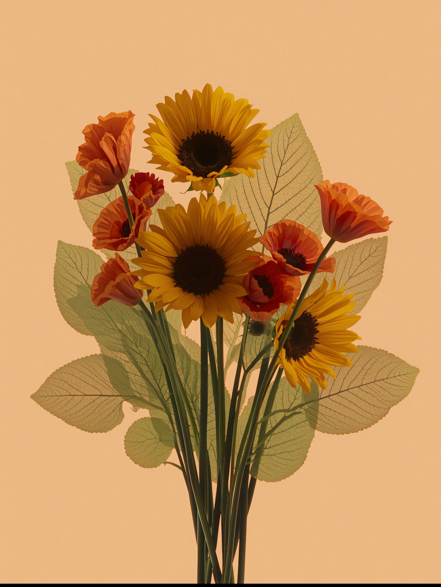A vibrant bouquet of sunflowers and orange poppies against a soft peach background, showcasing natural beauty and vivid colors.