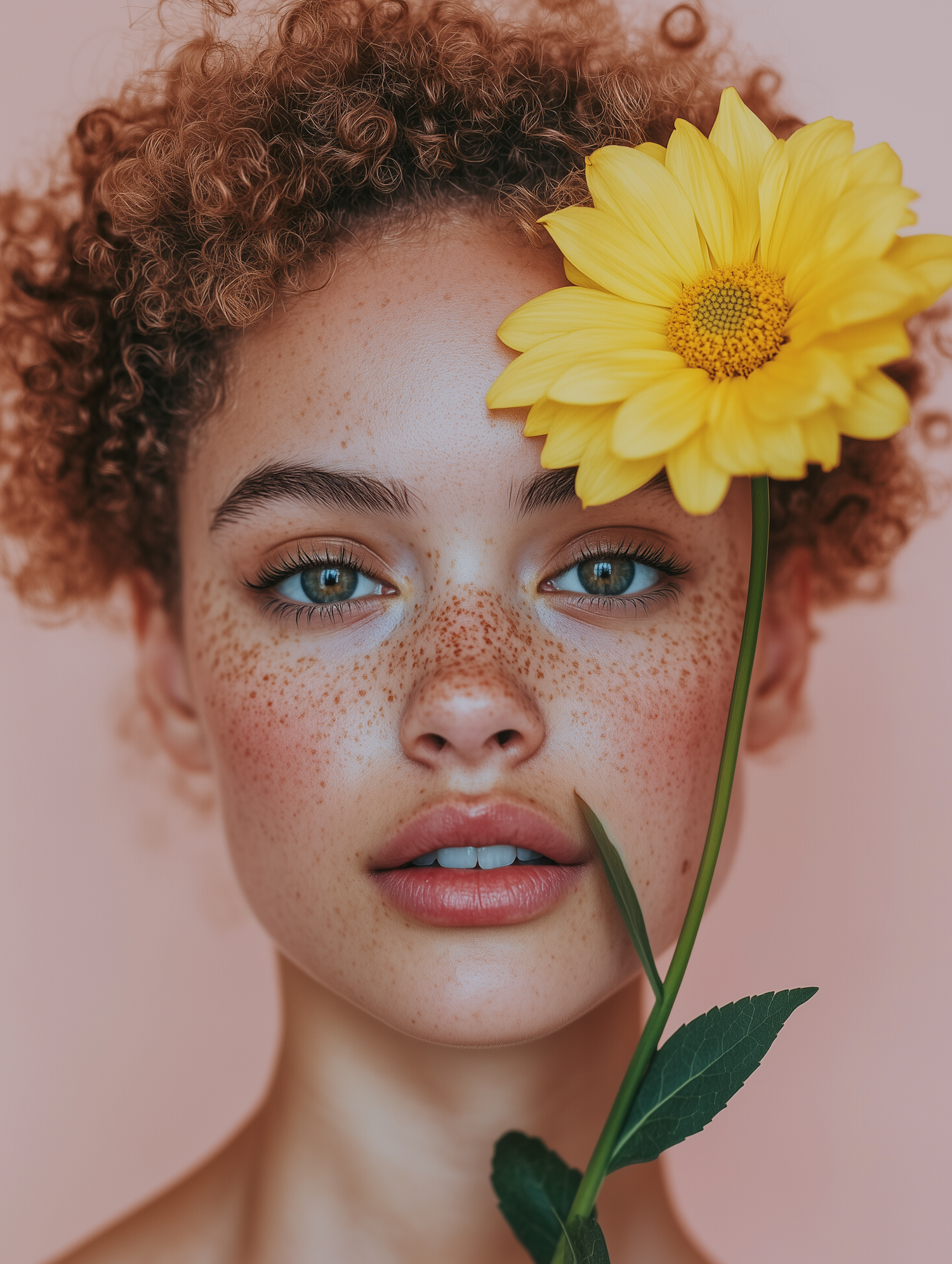Close-up of a freckled woman with curly hair holding a yellow sunflower, set against a soft pink background. Vibrant and serene.