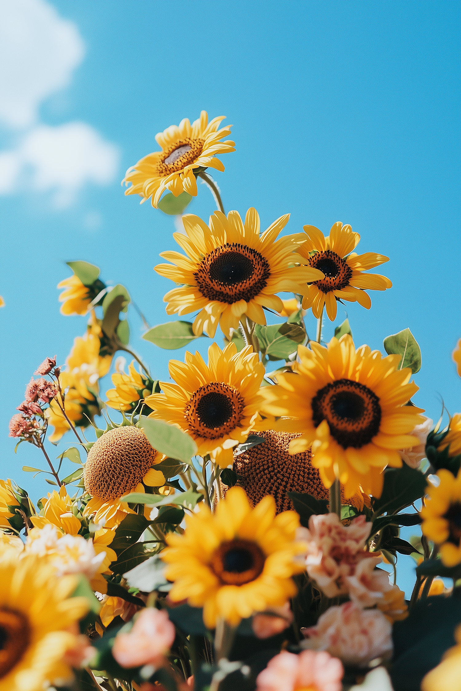 Bright sunflowers in full bloom against a vivid blue sky, accented by pink flowers and lush green leaves. A cheerful, sunny scene.