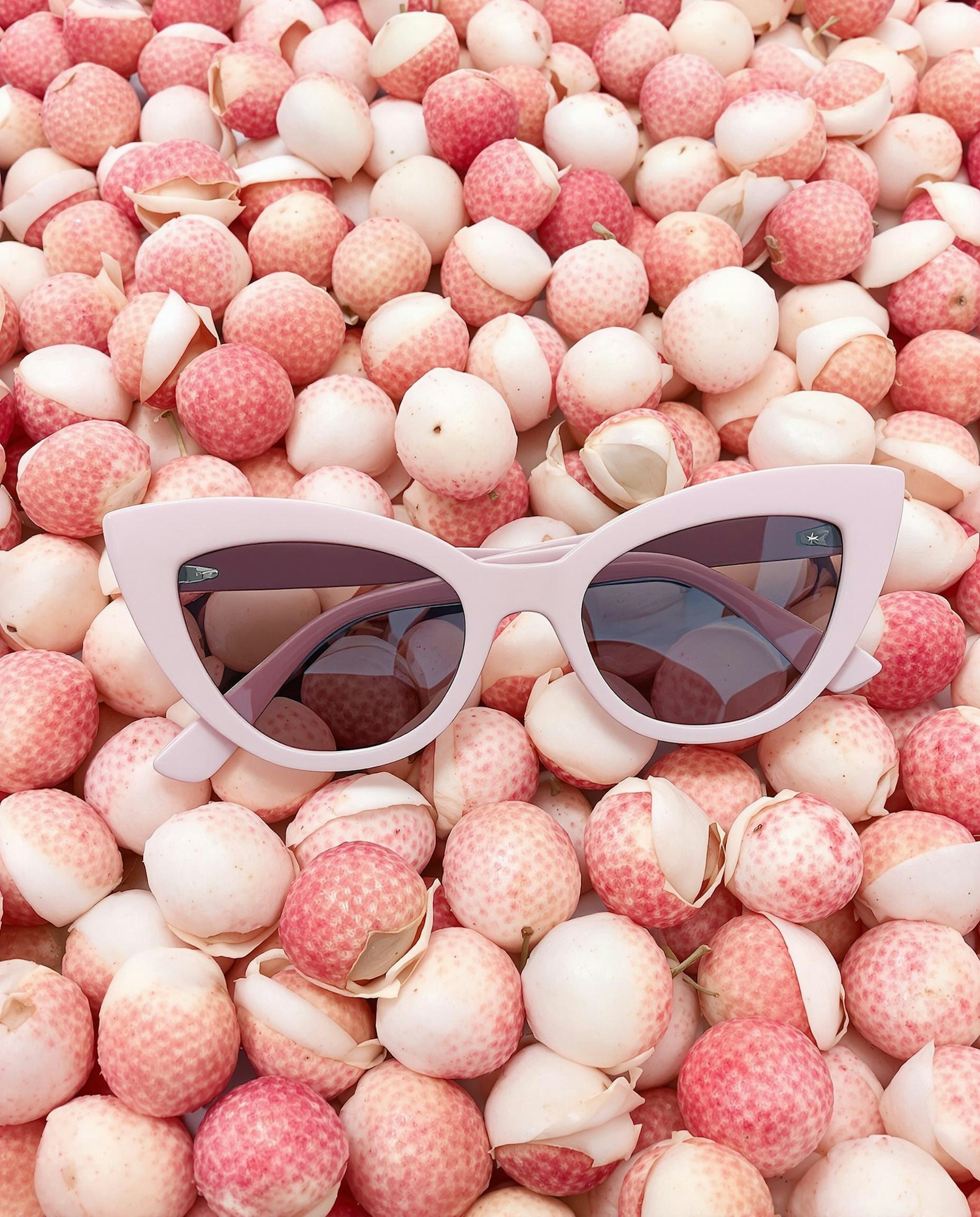 Cat-eye sunglasses with exaggerated points, in creamy pastel pink, placed on a complete surface of lychees with peeled and unpeeled textures. Fresh, glossy, tactile look.