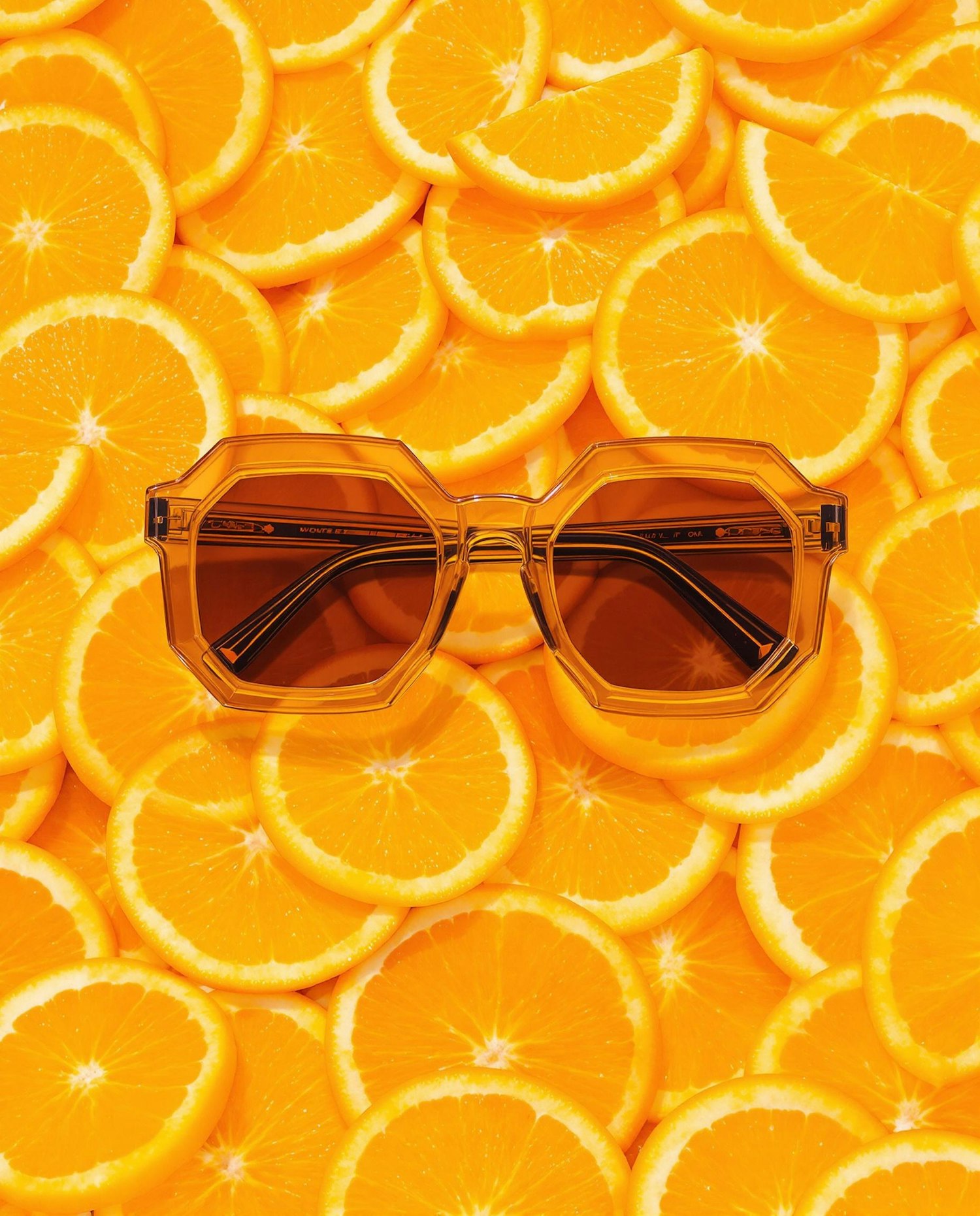 Hexagonal sunglasses in translucent amber, lying on a background entirely covered with orange slices. Bold citrus tones, juicy shine, no background showing.