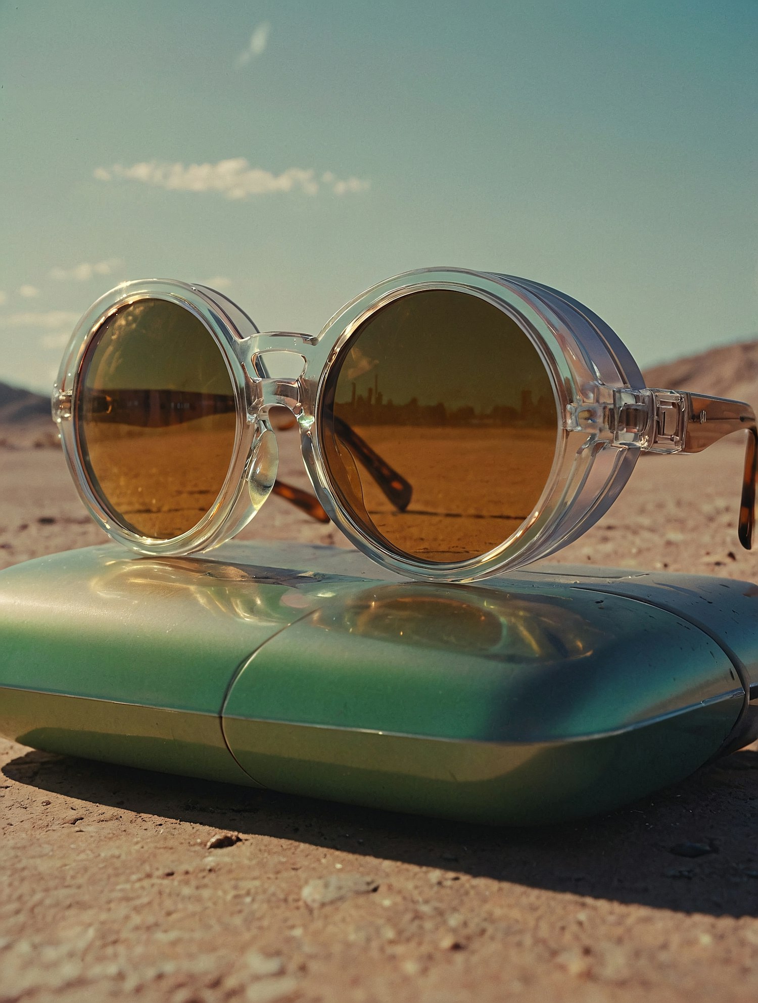 Stylish round sunglasses with transparent frames and tinted lenses resting on a mint-green case in a sunny desert setting.