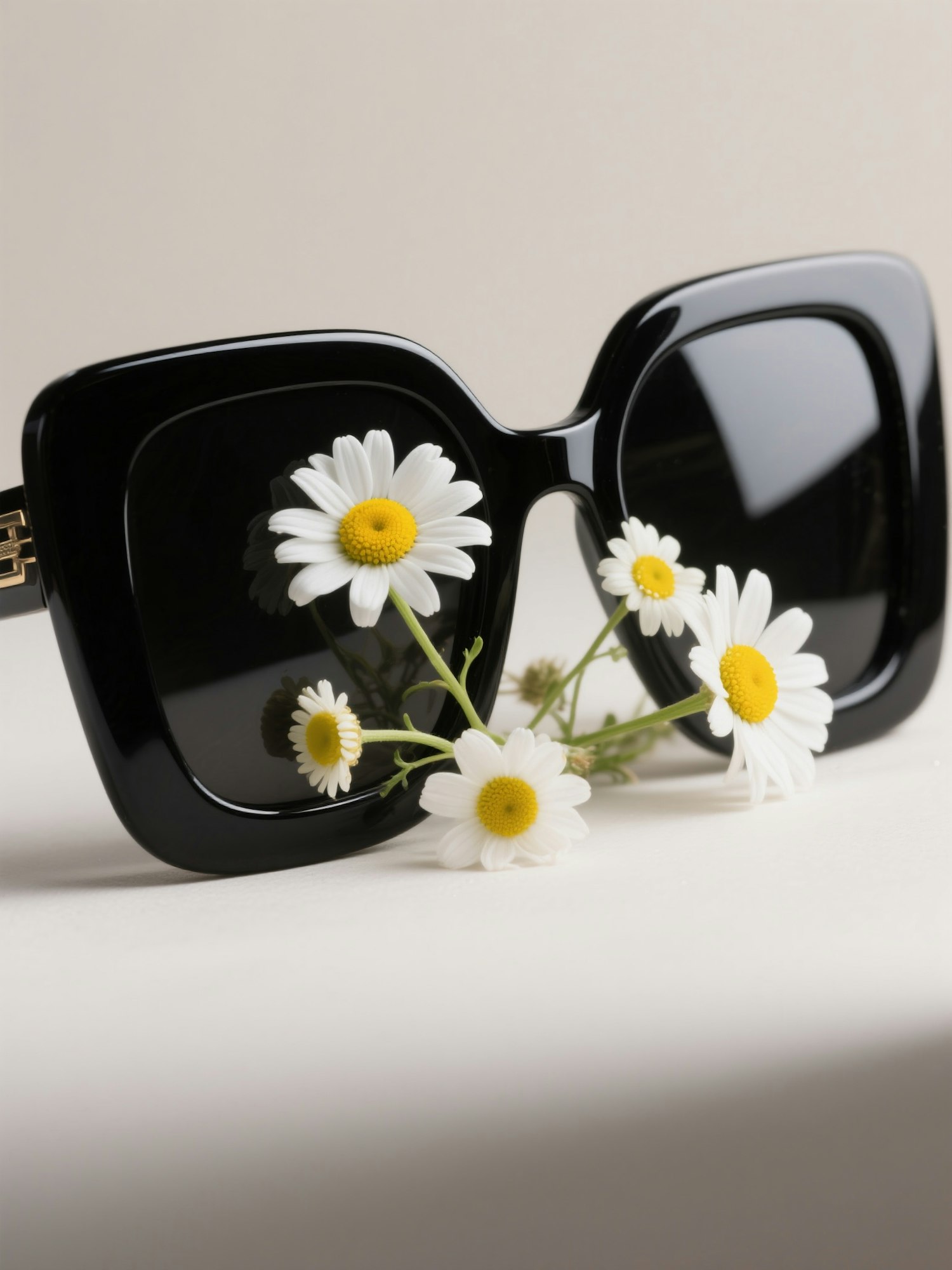 Ultra high resolution editorial product photography, minimalist background, soft diffused lighting, natural shadows, sharp focus on subject, modern fashion campaign aesthetic, delicate floral composition integrated with the subject, harmonious color palette, realistic textures — close-up of oversized black square sunglasses with glossy finish, framed by fresh white daisies with vibrant yellow centers, flowers naturally resting against the lenses