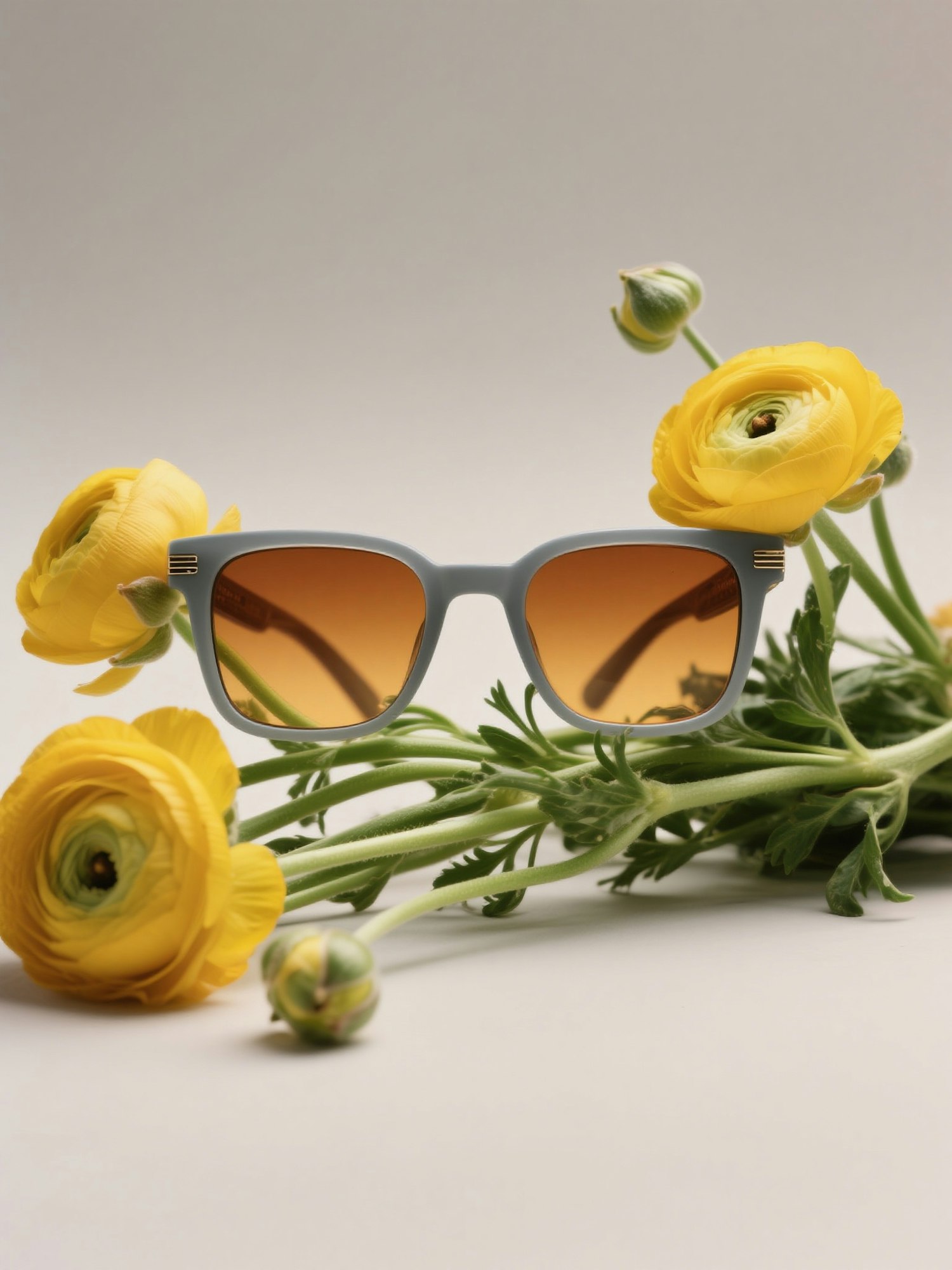 Ultra high resolution editorial product photography, minimalist background, soft diffused lighting, natural shadows, sharp focus on subject, modern fashion campaign aesthetic, delicate floral composition integrated with the subject, harmonious color palette, realistic textures, flowers and stems arranged naturally without passing through or intersecting the lenses or frames — modern rectangular sunglasses with amber-tinted lenses, entangled with bright yellow ranunculus flowers and green stems, petals softly resting against the sides of the frame