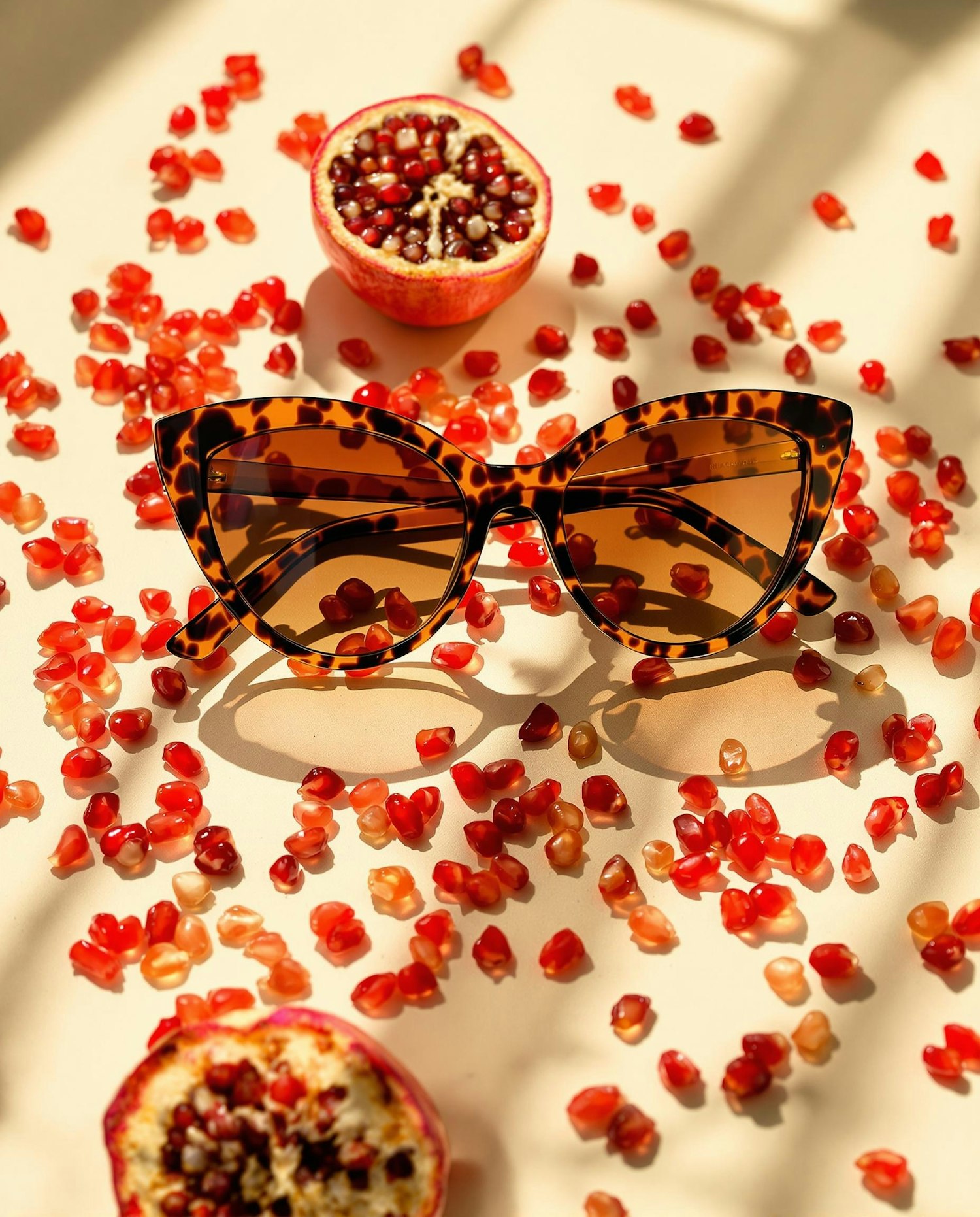 Retro cat-eye sunglasses in tortoiseshell tones surrounded by scattered pomegranate seeds and halves. Creamy backdrop, warm sunlight, graphic shadows