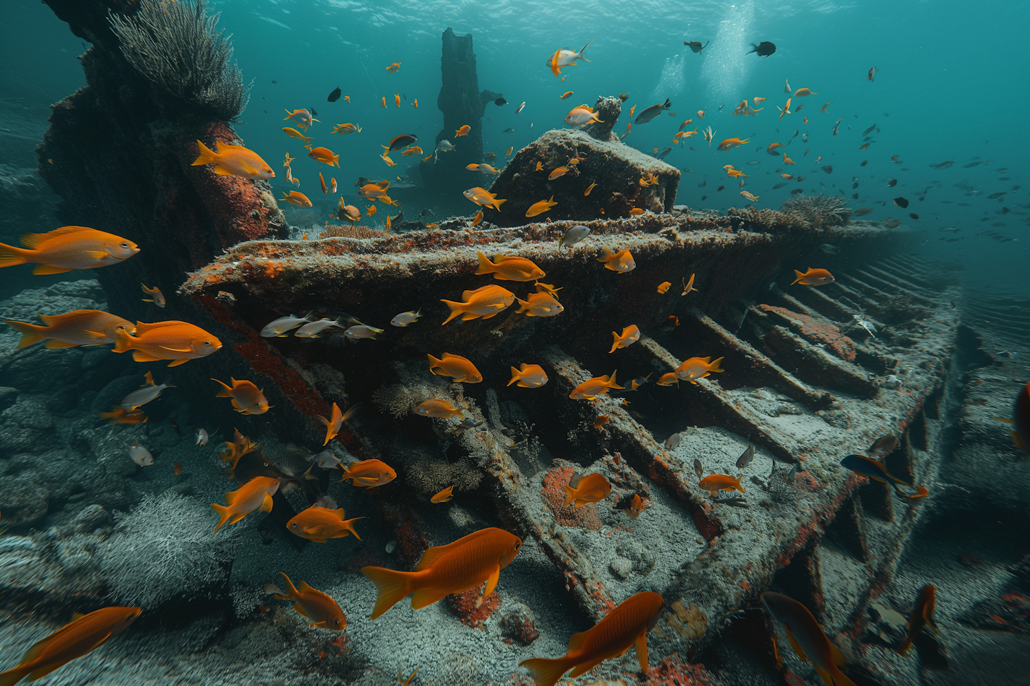 Underwater scene of a shipwreck teeming with orange fish and marine life, set against a clear blue-green ocean backdrop.