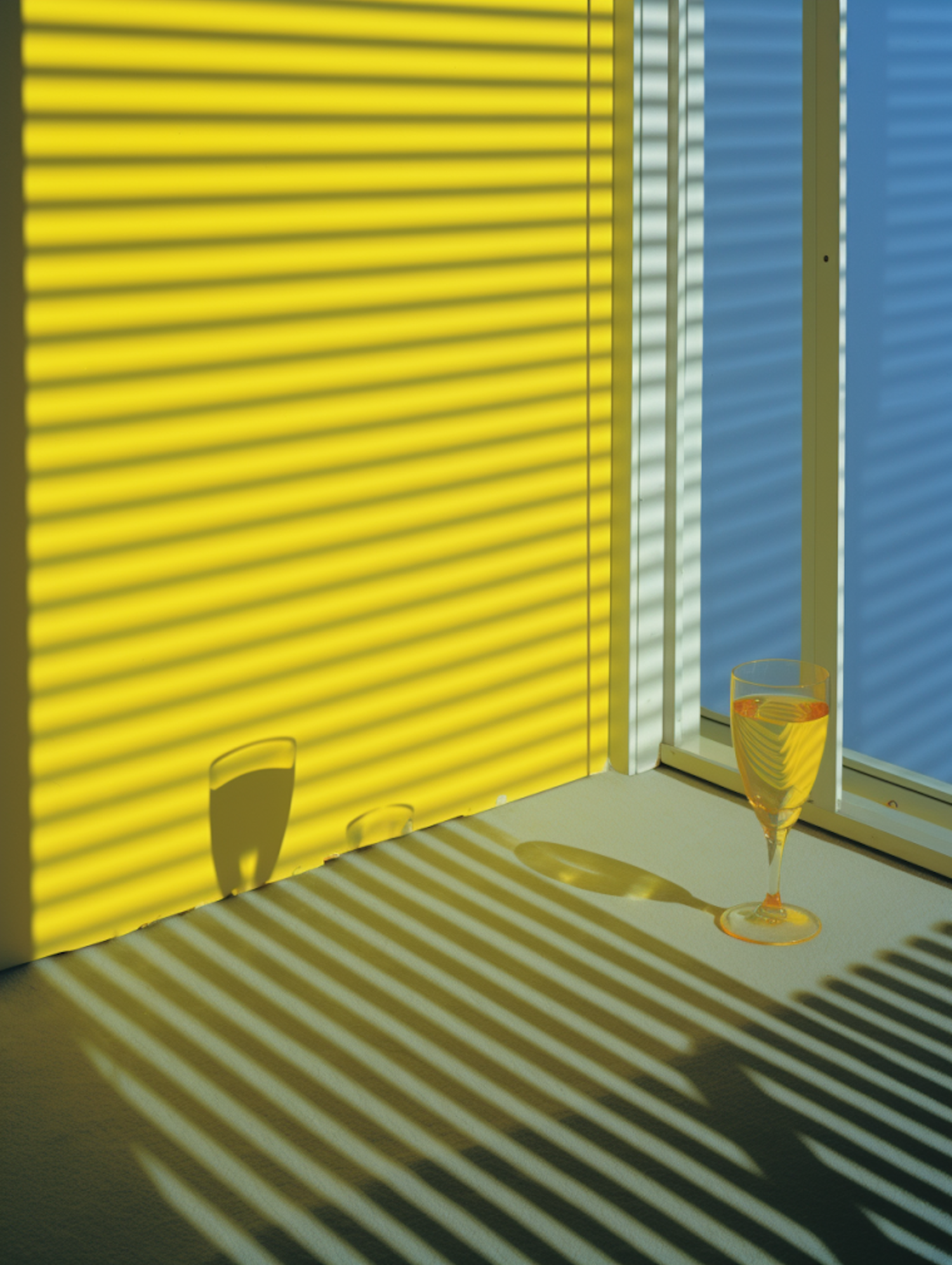 Vibrant yellow wall with striped shadows from blinds, a glass of yellow liquid on the sill, creating a dynamic light pattern.