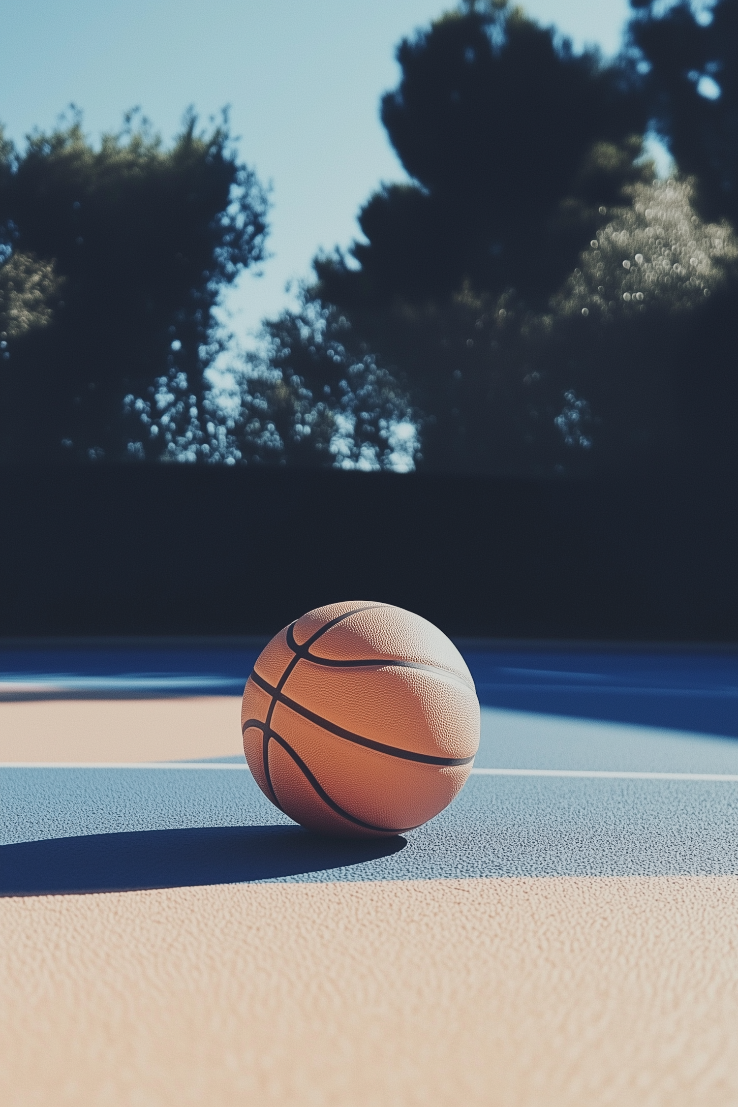 A basketball on a sunlit outdoor court with blue and beige colors, surrounded by tree shadows and a clear sky.