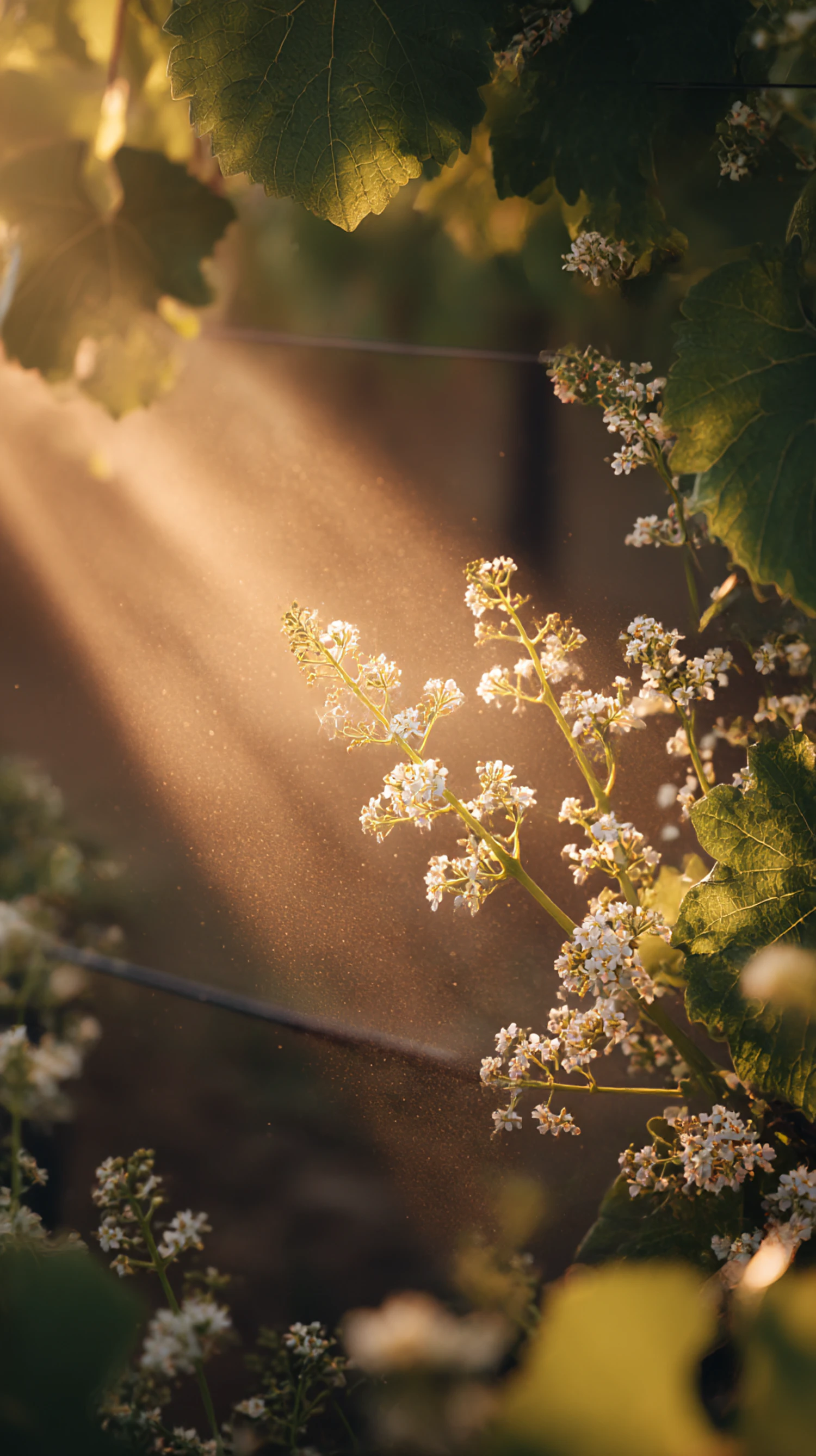 Golden sunlight illuminates delicate white blossoms and green leaves, creating a serene and ethereal natural scene.