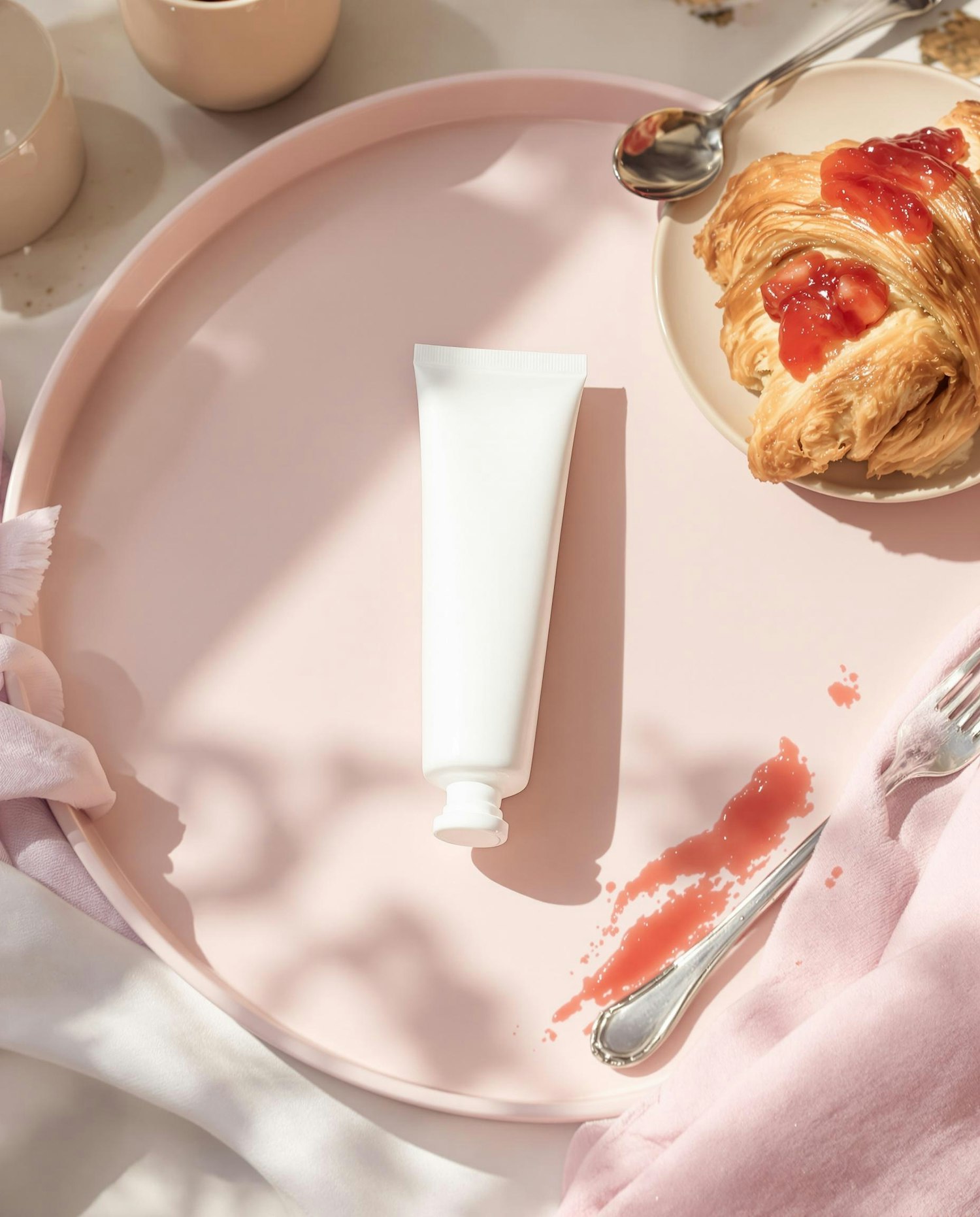 A pastel breakfast setting with a white tube, a croissant with jam, and utensils on a soft pink background in sunny lighting.
