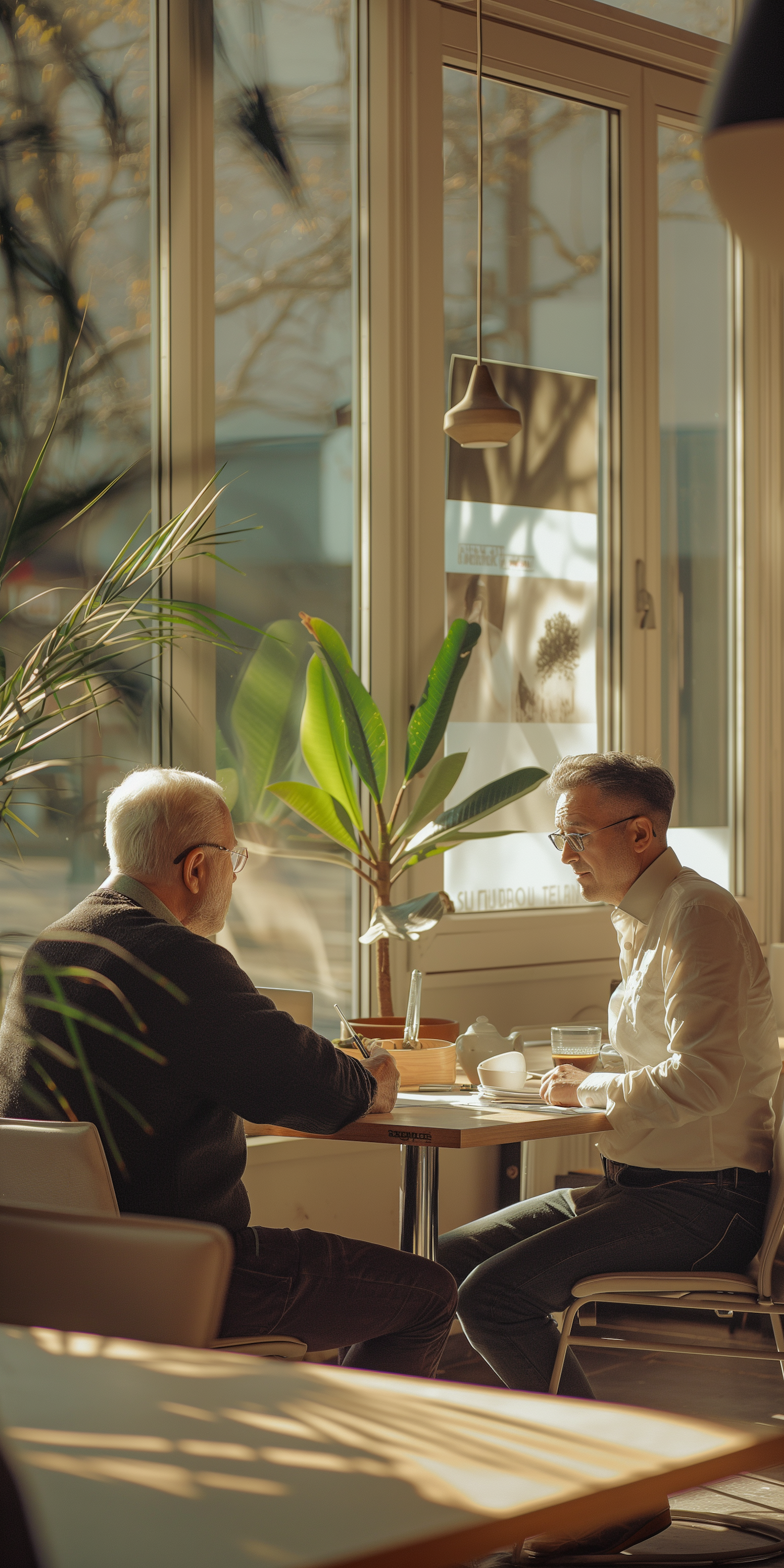 Two men in a sunlit cafe, engaged in conversation. Warm light, large windows, and a potted plant create a cozy atmosphere.