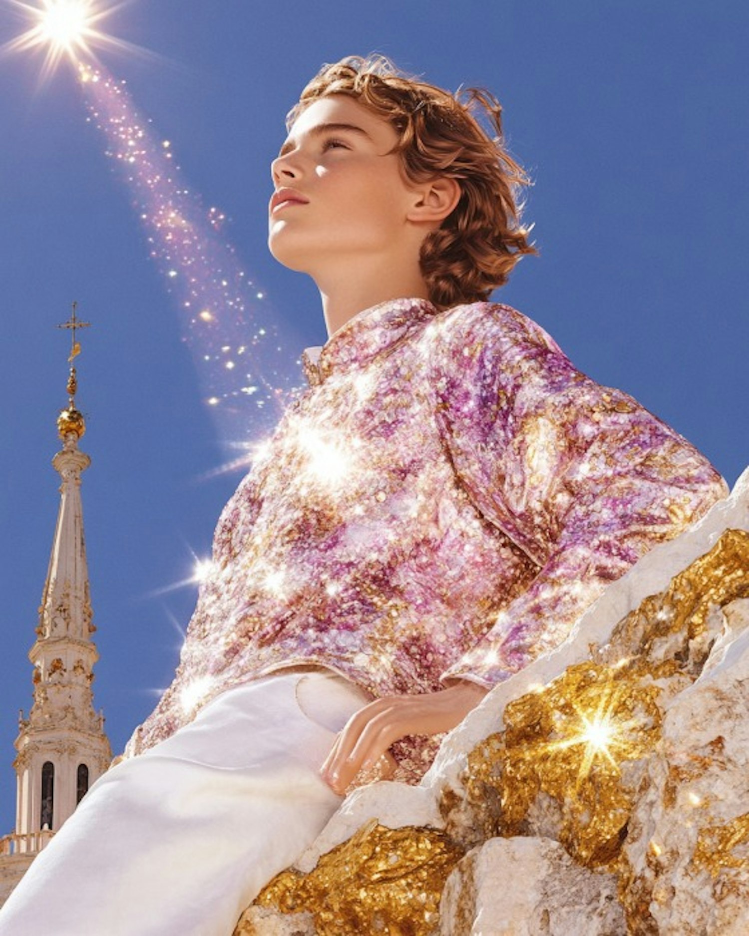 A young woman in a sparkling top gazes at the sun, surrounded by golden rocks and a majestic spire under a clear blue sky.