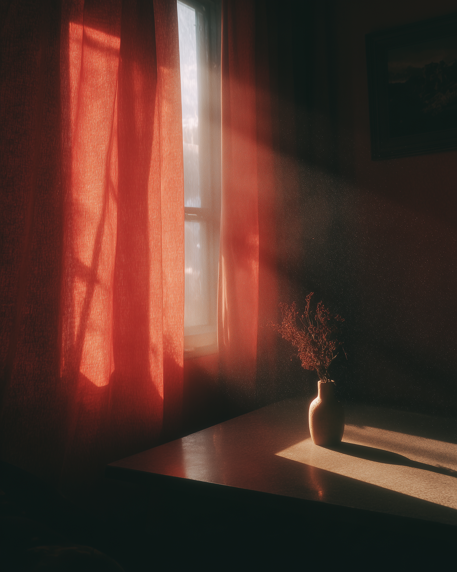 Sunlight filters through red curtains, illuminating a vase with dried flowers on a table, creating a warm and tranquil atmosphere.