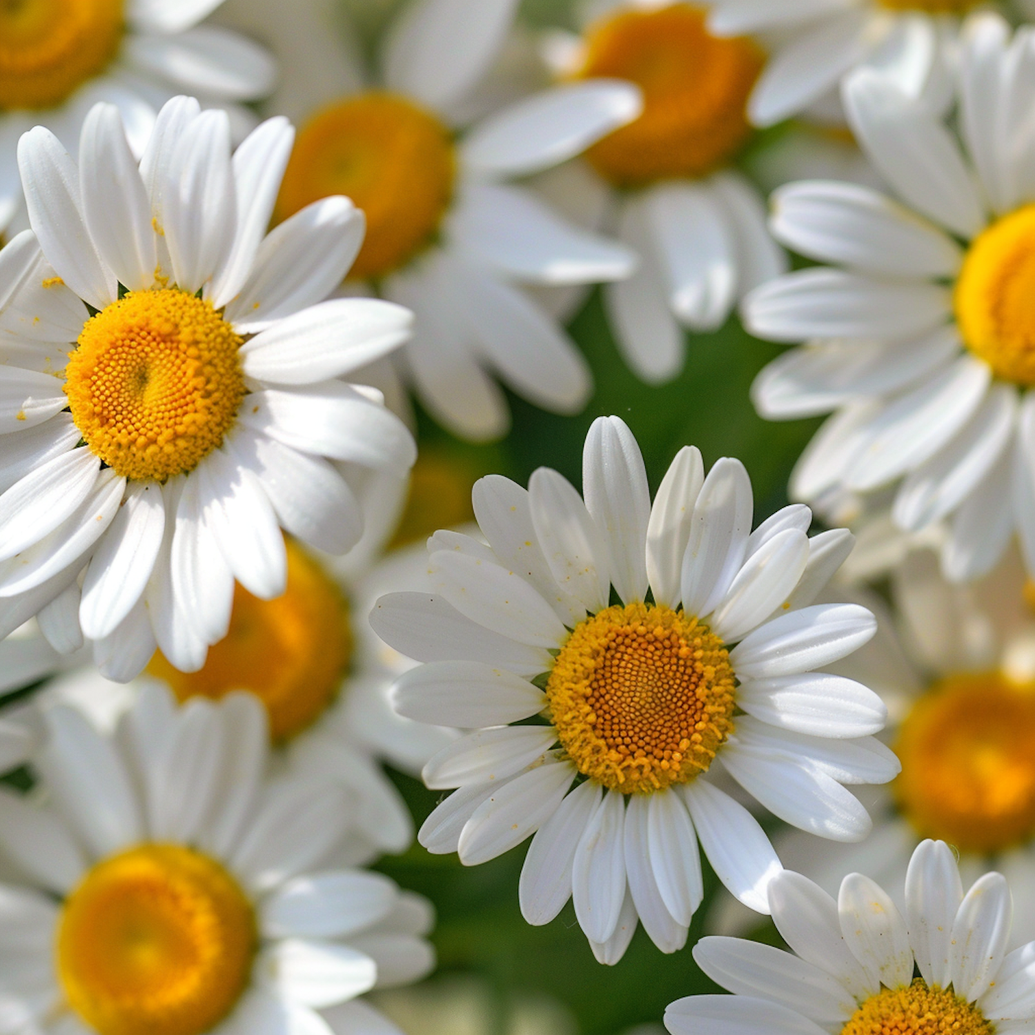 Close-up of vibrant daisies with white petals and yellow centers, set against a blurred green background.