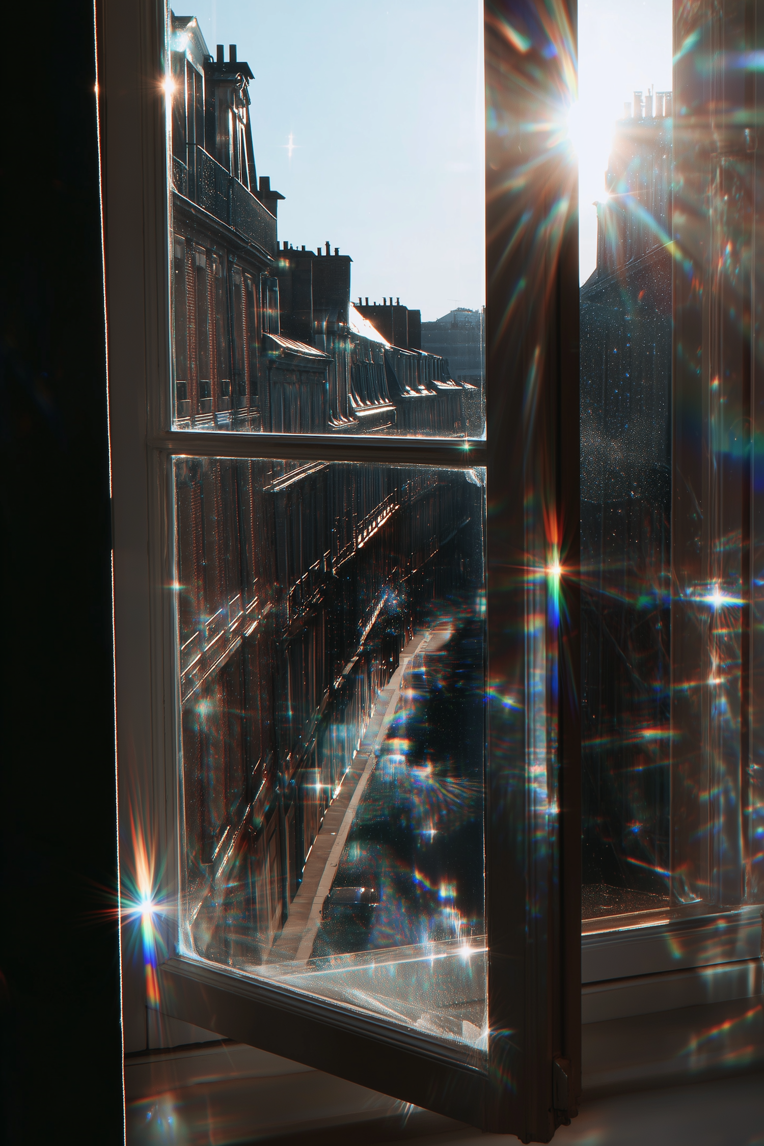 Sunlight through an open window creates rainbow flares, revealing a view of European-style buildings with chimneys and steep roofs.