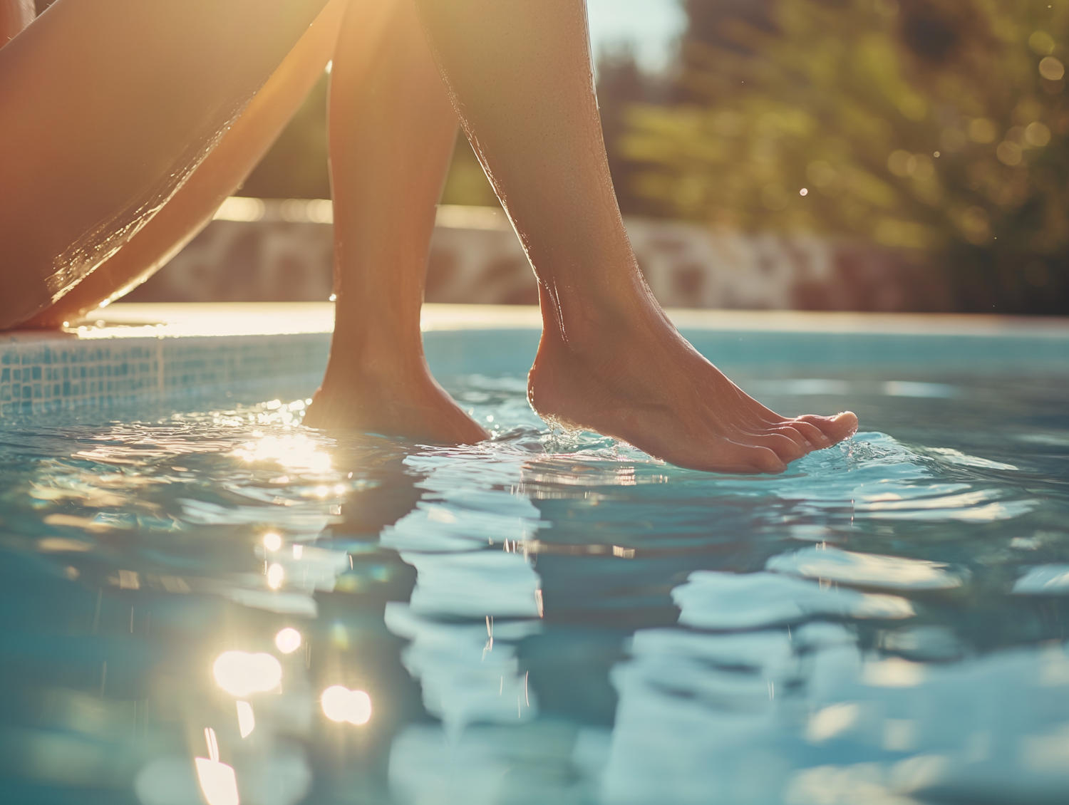 Close-up of legs dipping into a sunlit pool, with water reflections and a serene, relaxing atmosphere.