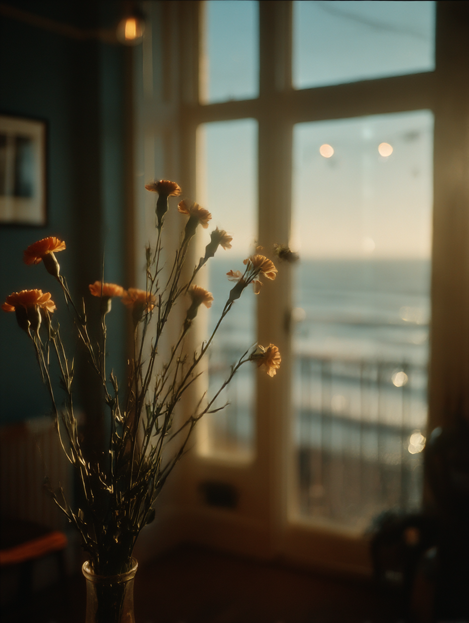 A vase of orange flowers in a sunlit room with a view of the ocean through large windows, creating a serene and warm atmosphere.