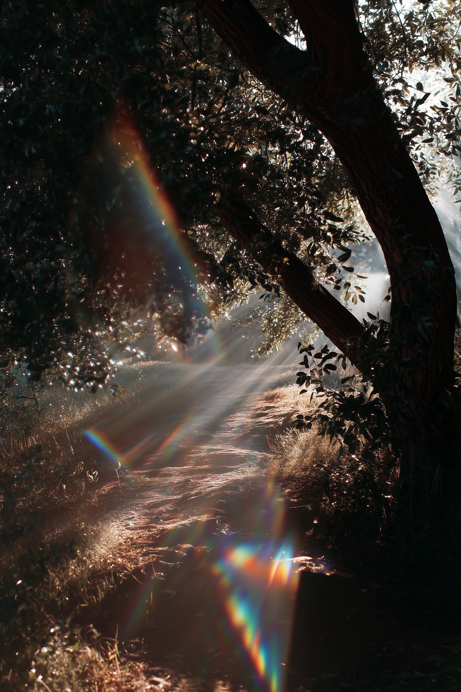 Sunlight streams through trees onto a forest path, with magical rainbow light refractions creating a serene and enchanting atmosphere.