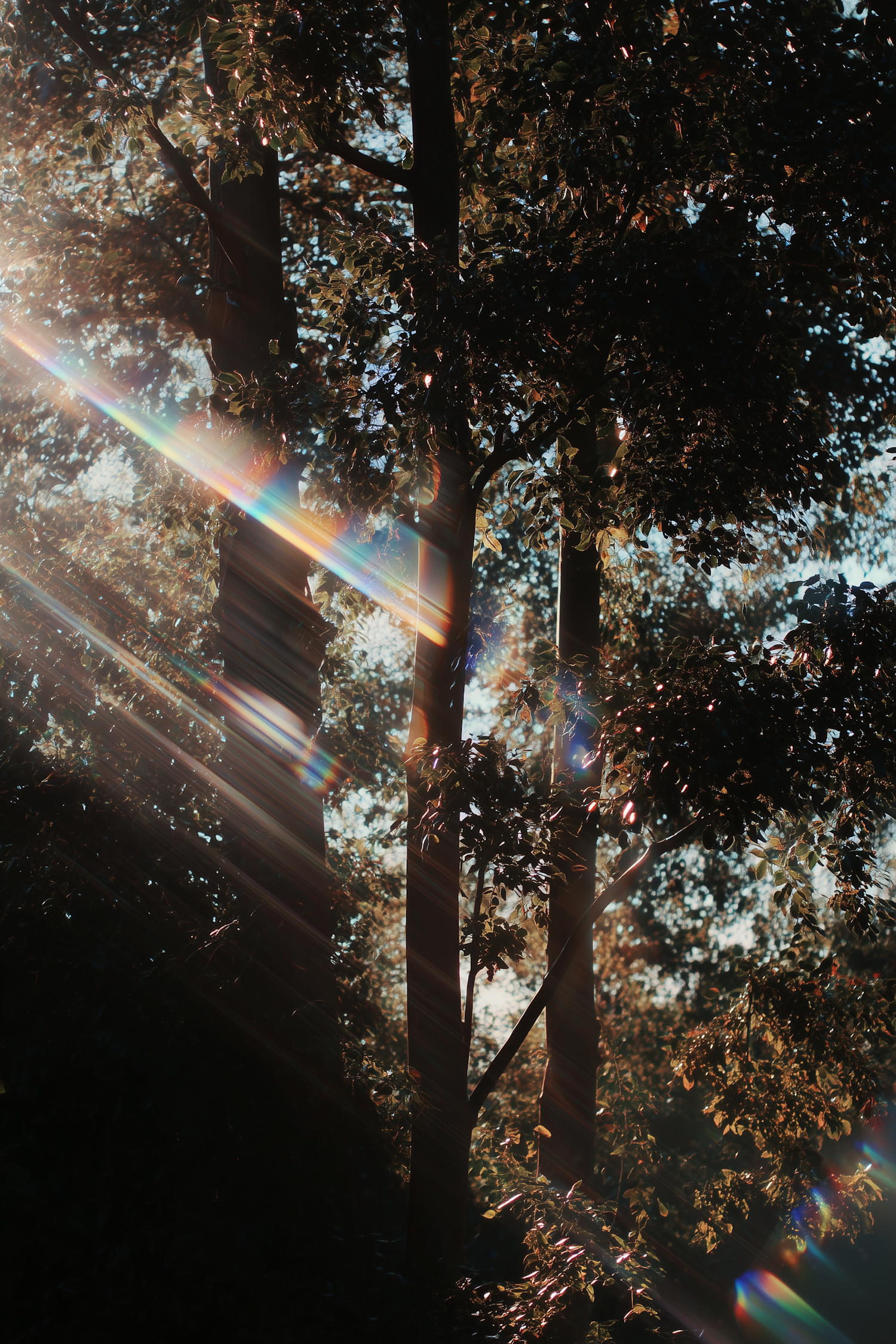 Sunlight filters through dense tree foliage, creating magical rainbow lens flares and a serene, enchanting forest atmosphere.
