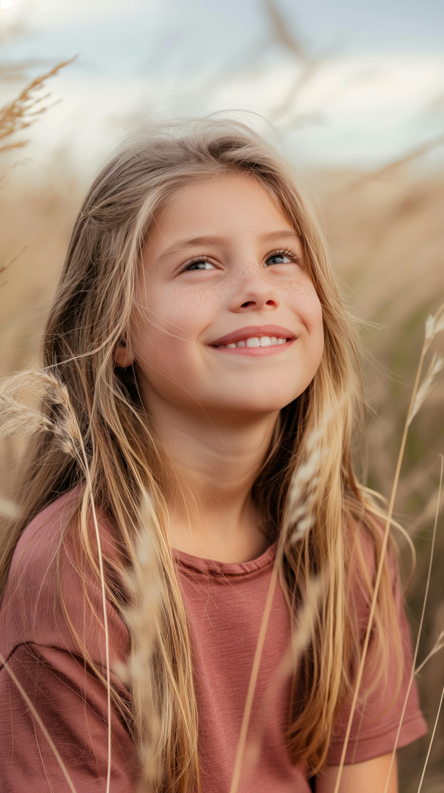 Young girl with long hair smiling in a field of golden grass, wearing a pink shirt. Sunlight enhances her joyful expression.