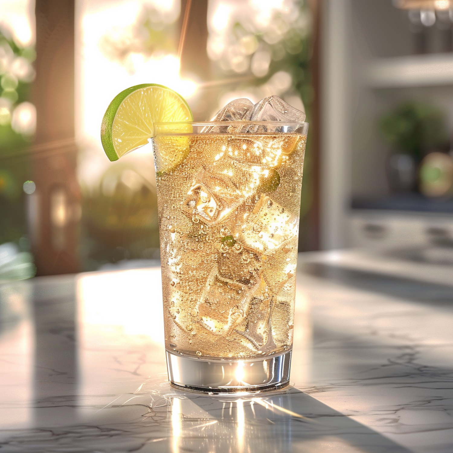 Refreshing sparkling drink with ice and lime on a sunlit marble countertop, creating a lively and fresh atmosphere.