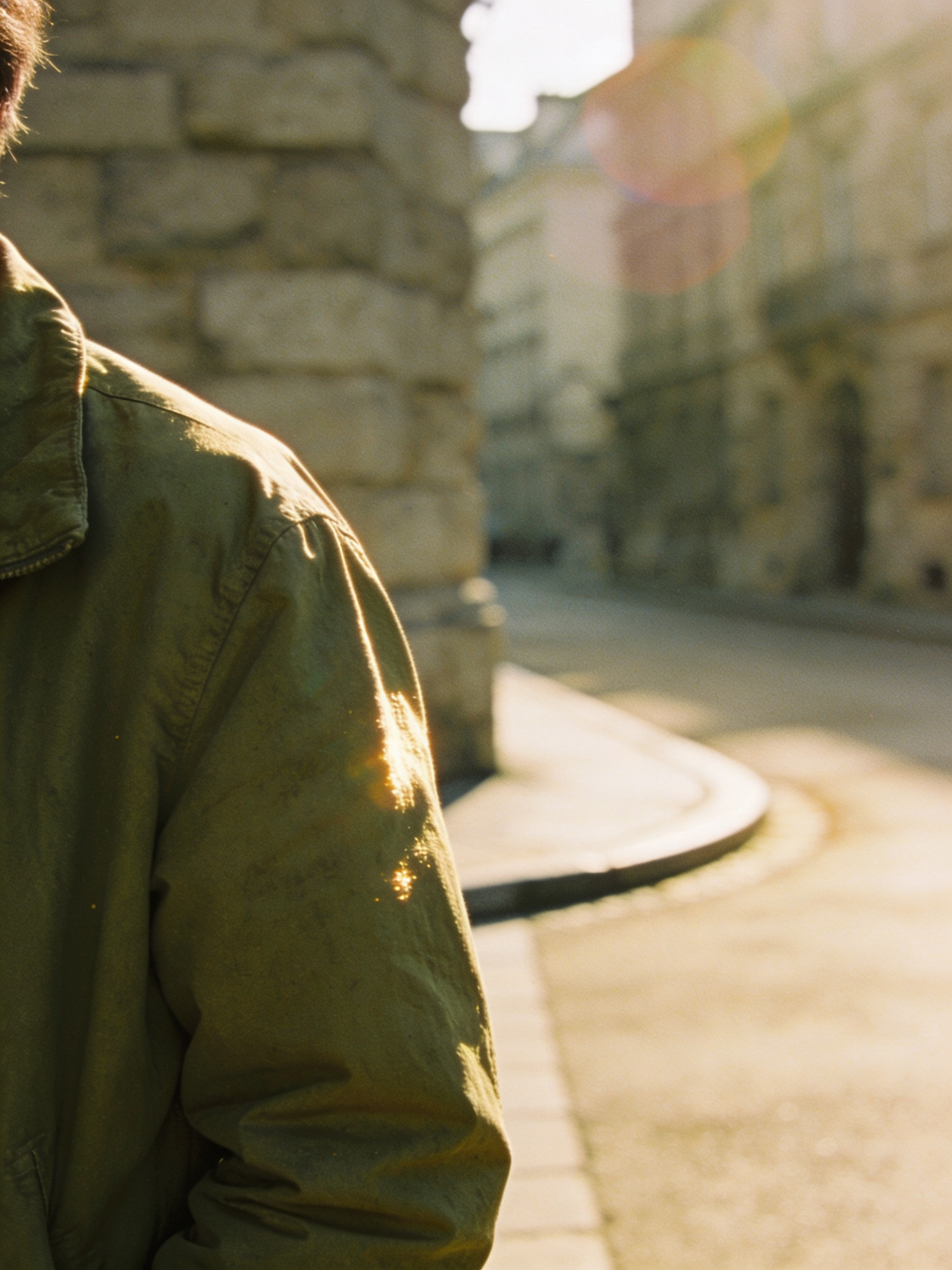 Close-up of a green jacket reflecting sunlight, with a blurred urban street and stone buildings in the background.