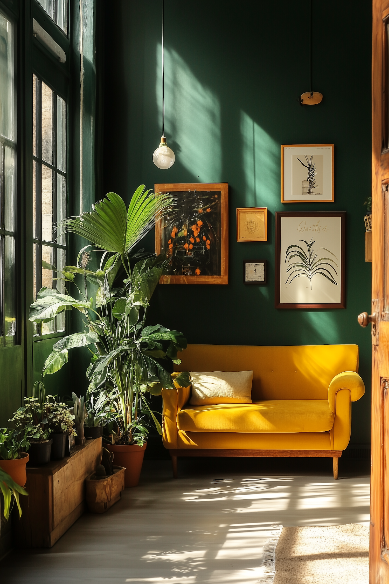 Bright yellow sofa in a green-walled room with lush plants, framed art, and sunlight streaming through tall windows. Cozy and vibrant decor.