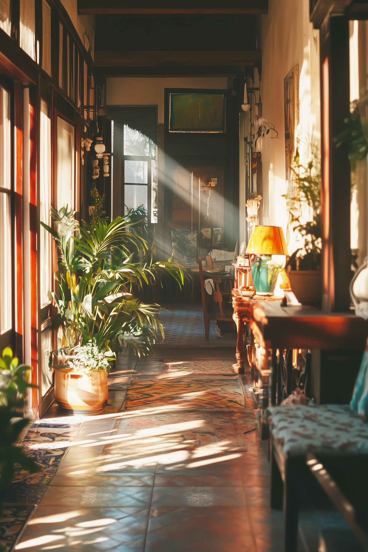 Sunlit hallway with patterned tiles, lush plants, and warm decor, creating a cozy and inviting atmosphere.