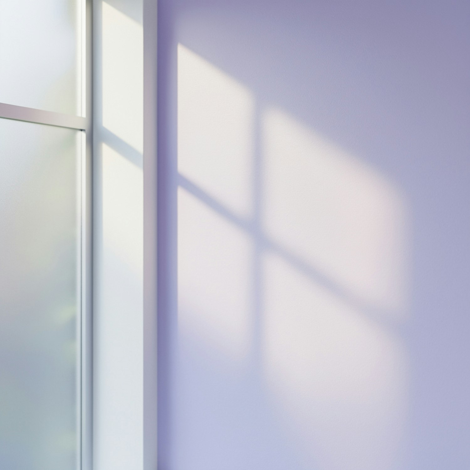 Soft sunlight filters through a frosted window, casting a serene shadow on a lavender wall, creating a minimalist and calming scene.